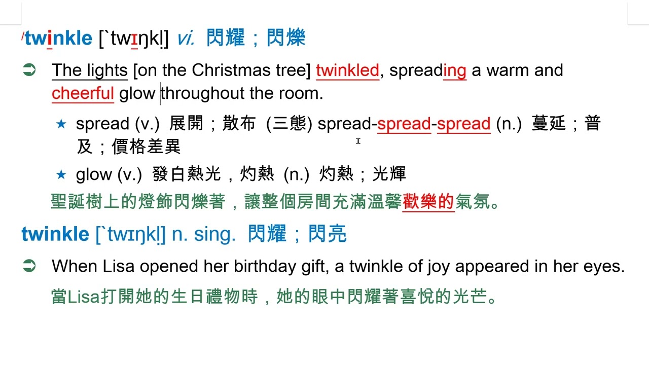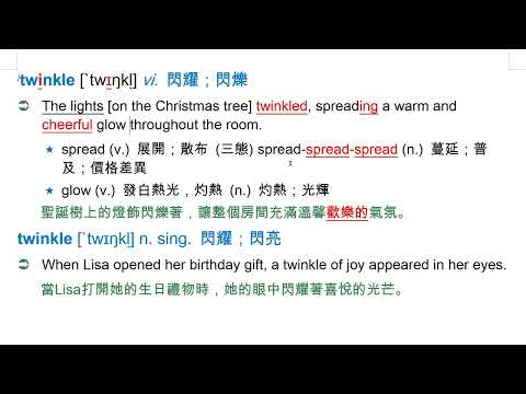 載入中... 相關課程 Back twinkle [`twɪŋkḷ] vi. 閃耀;閃爍 相關課程 0 / 750 登入觀看 twinkle [`twɪŋkḷ] vi. 閃耀;閃爍 上傳學習單 下載學習單