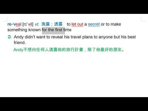 載入中... 相關課程 Back reveal [rɪ`vil] vt. 洩漏;透露 相關課程 0 / 750 登入觀看 ⇐ Use this menu to view and help create subtitles for this video in many different languages. You'll probably want to hide YouTube's captions if using these subtitles. reveal [rɪ`vil] vt. 洩漏;透露 上傳學習單 下載學習單
