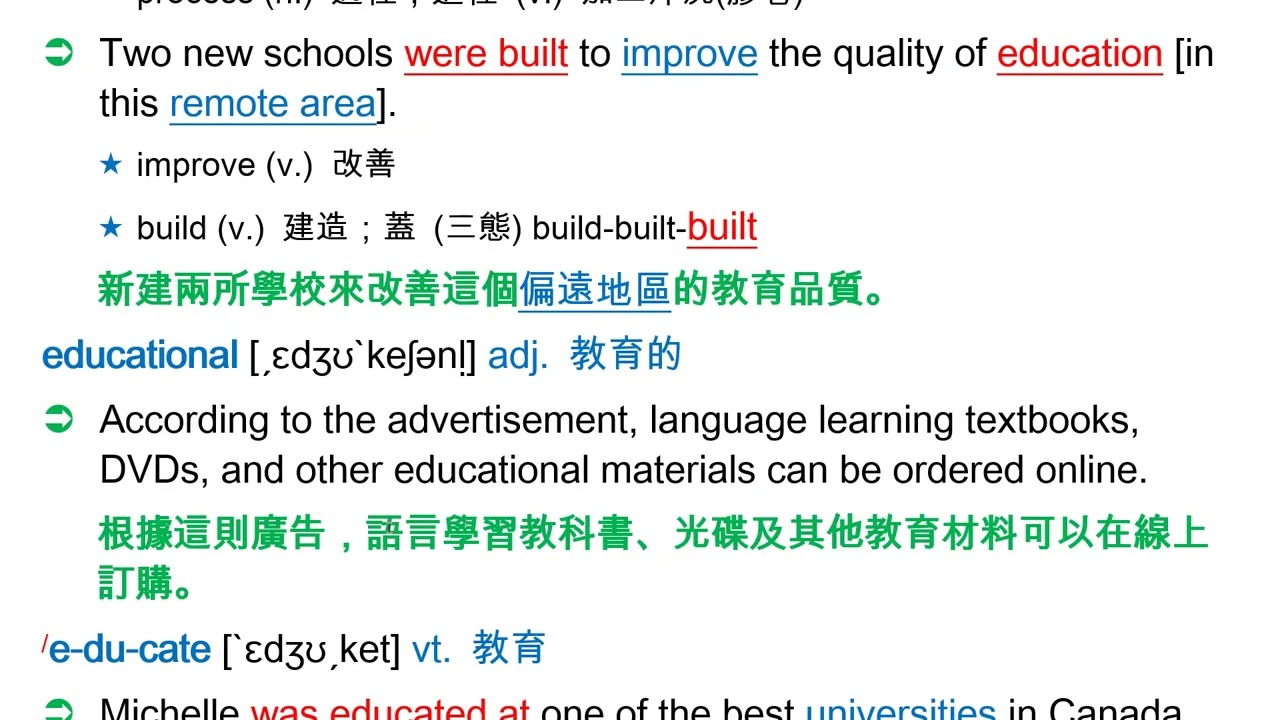 載入中... 相關課程 Back education [ˏɛdʒʊ`keʃən] n. [U] 教育 相關課程 0 / 750 登入觀看 ⇐ Use this menu to view and help create subtitles for this video in many different languages. You'll probably want to hide YouTube's captions if using these subtitles. education [ˏɛdʒʊ`keʃən] n. [U] 教育 上傳學習單 下載學習單