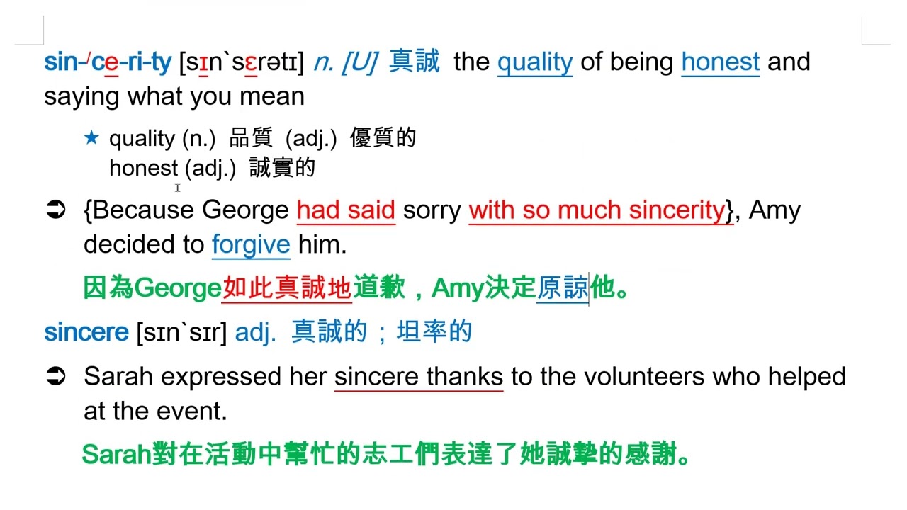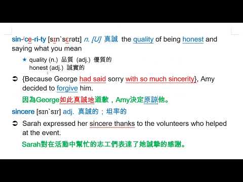 載入中... 相關課程 Back sincerity [sɪnˋsɛrətɪ] n. [U] 真誠 相關課程 0 / 750 登入觀看 ⇐ Use this menu to view and help create subtitles for this video in many different languages. You'll probably want to hide YouTube's captions if using these subtitles. sincerity [sɪnˋsɛrətɪ] n. [U] 真誠 上傳學習單 下載學習單