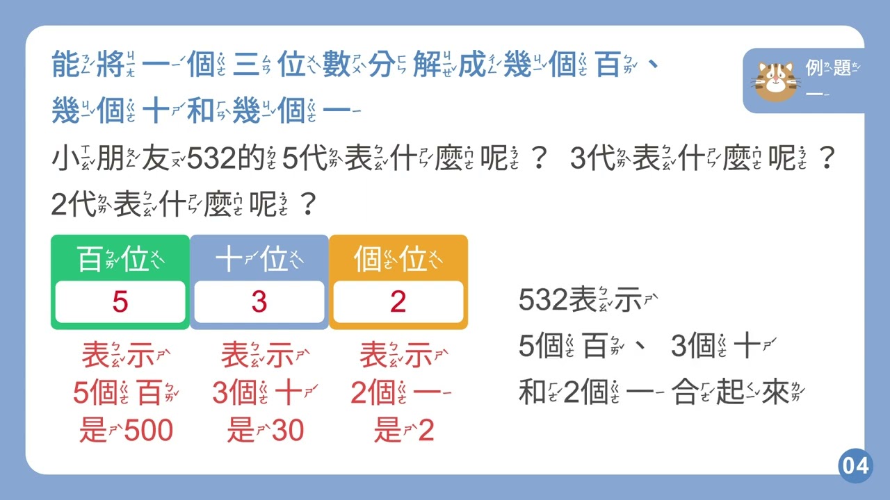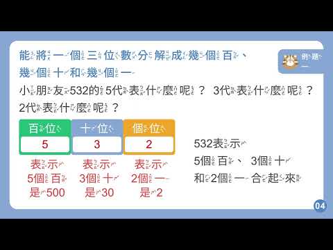 載入中... 相關課程 Back 【解題】能將一個三位數分解成幾個百、幾個十和幾個一 相關課程 0 / 750 登入觀看 ⇐ Use this menu to view and help create subtitles for this video in many different languages. You'll probably want to hide YouTube's captions if using these subtitles. 【解題】能將一個三位數分解成幾個百、幾個十和幾個一 上傳學習單 下載學習單