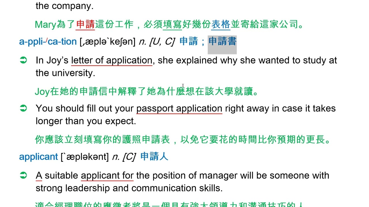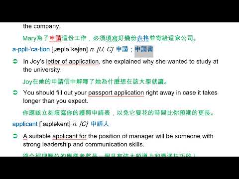 載入中... 相關課程 Back apply [ə`plaɪ] vi. 申請;報名 相關課程 0 / 750 登入觀看 ⇐ Use this menu to view and help create subtitles for this video in many different languages. You'll probably want to hide YouTube's captions if using these subtitles. apply [ə`plaɪ] vi. 申請;報名 上傳學習單 下載學習單