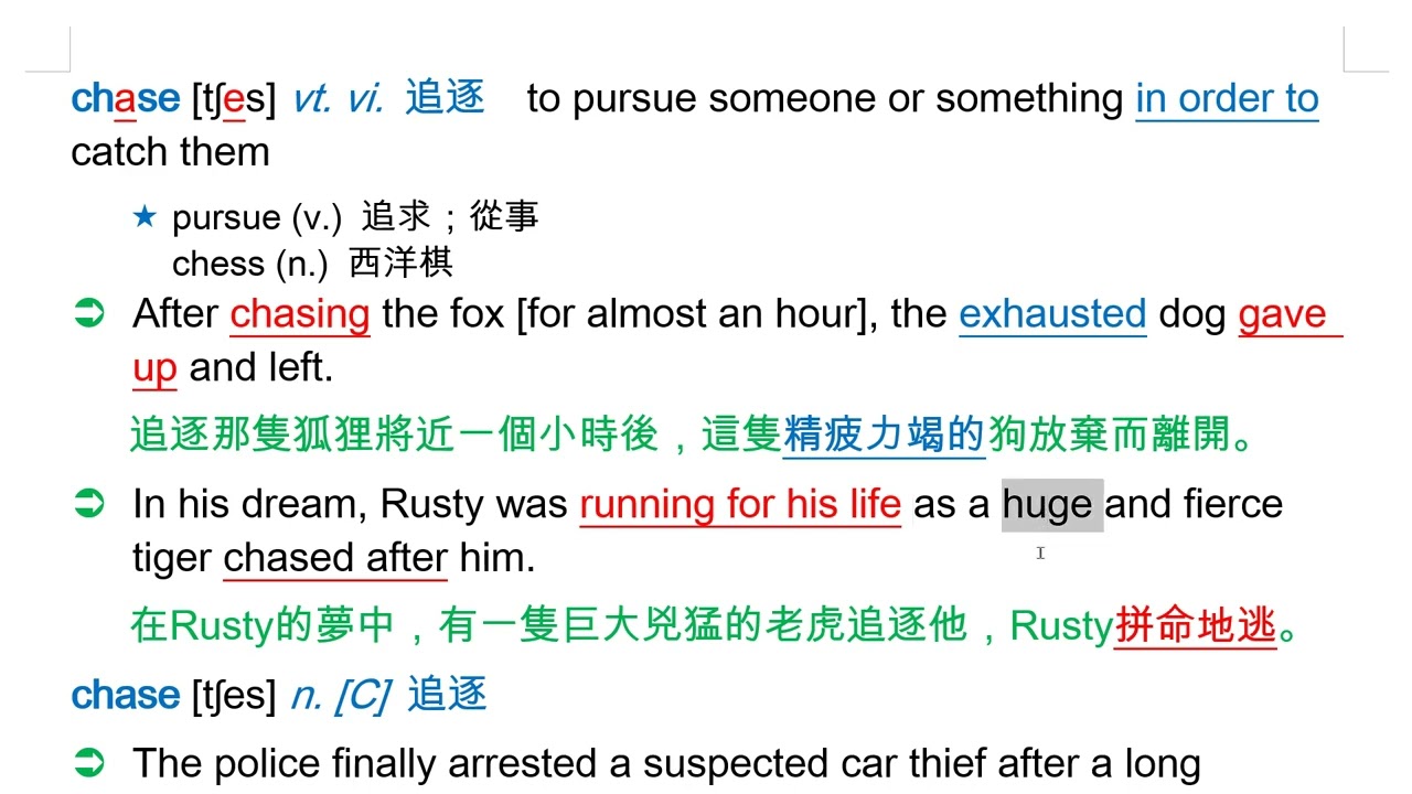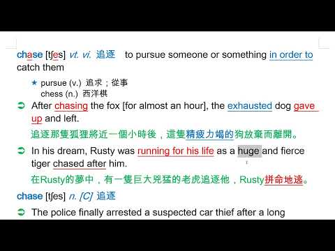 載入中... 相關課程 Back chase [tʃes] vt. vi. 追逐 相關課程 0 / 750 登入觀看 ⇐ Use this menu to view and help create subtitles for this video in many different languages. You'll probably want to hide YouTube's captions if using these subtitles. chase [tʃes] vt. vi. 追逐 上傳學習單 下載學習單