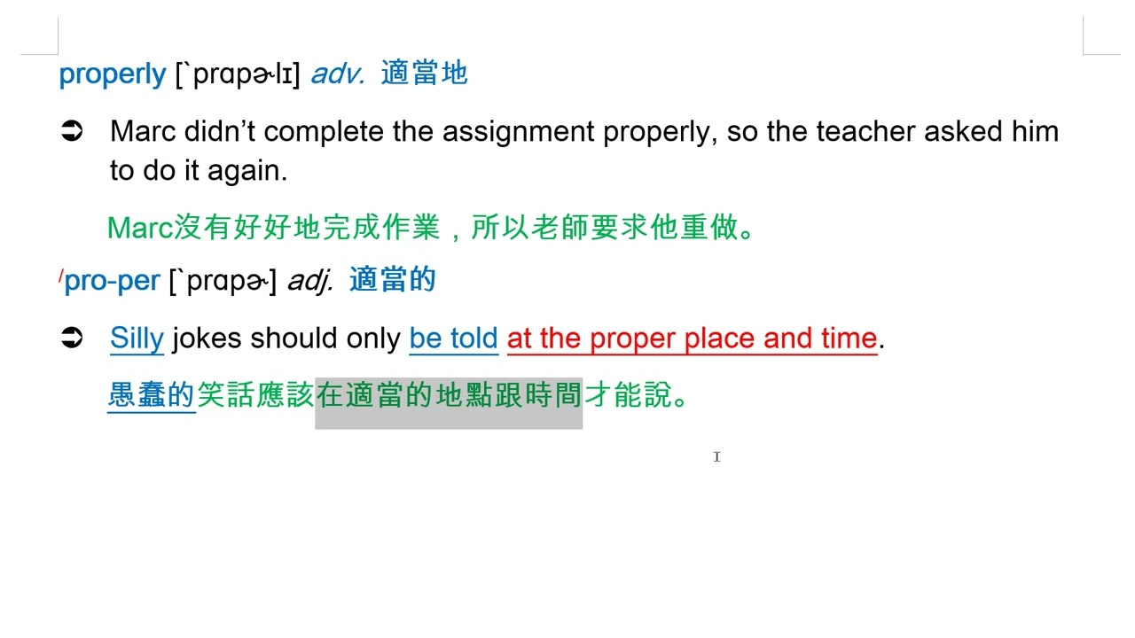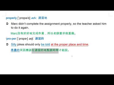 載入中... 相關課程 Back properly [`prɑpɚlɪ] adv. 適當地 相關課程 0 / 750 登入觀看 ⇐ Use this menu to view and help create subtitles for this video in many different languages. You'll probably want to hide YouTube's captions if using these subtitles. properly [`prɑpɚlɪ] adv. 適當地 上傳學習單 下載學習單