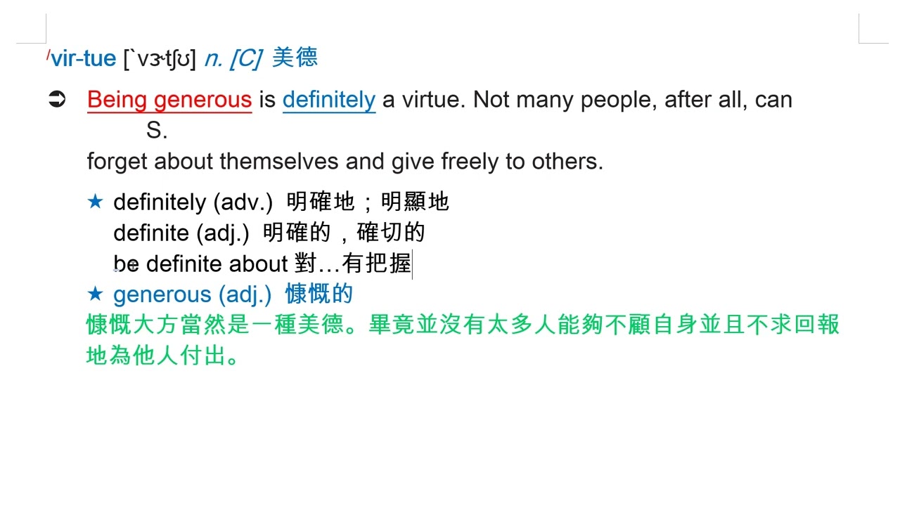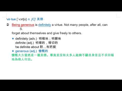 載入中... 相關課程 Back virtue [`vɝtʃʊ] n. [C] 美德 相關課程 0 / 750 登入觀看 ⇐ Use this menu to view and help create subtitles for this video in many different languages. You'll probably want to hide YouTube's captions if using these subtitles. virtue [`vɝtʃʊ] n. [C] 美德 上傳學習單 下載學習單