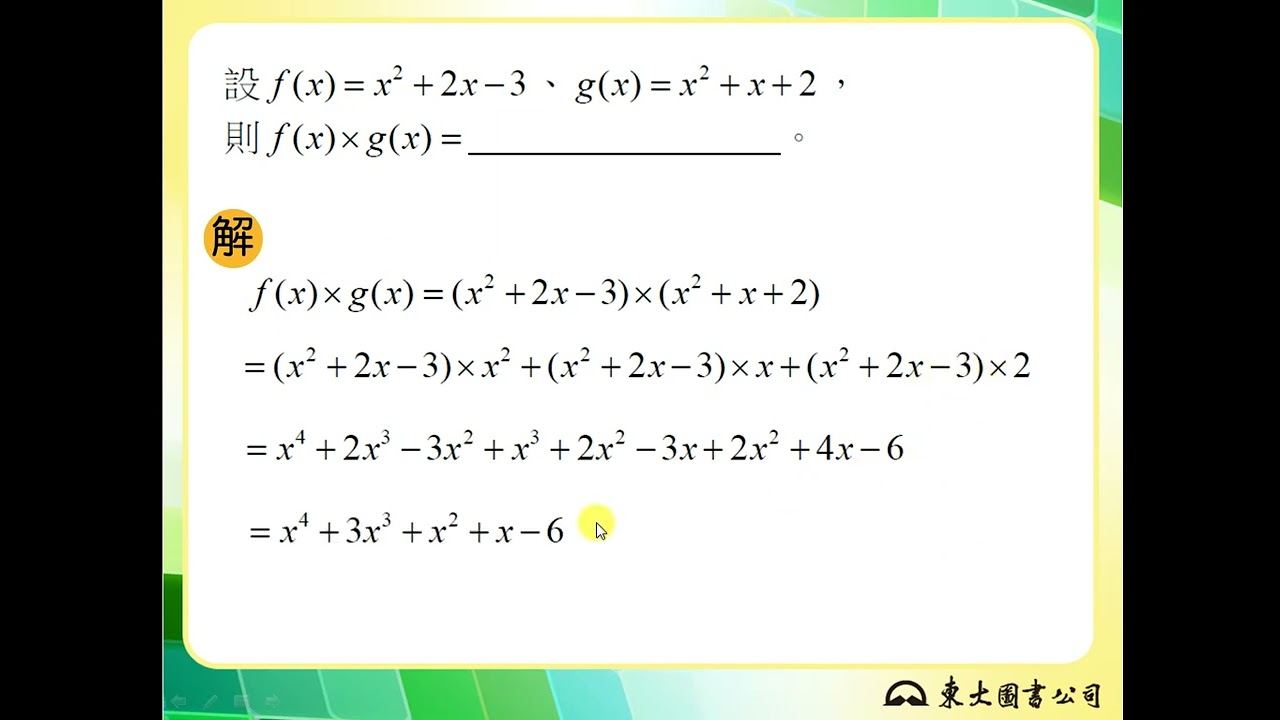 載入中... 相關課程 Back 【解題】多項式的乘法 相關課程 0 / 750 登入觀看 ⇐ Use this menu to view and help create subtitles for this video in many different languages. You'll probably want to hide YouTube's captions if using these subtitles. 【解題】多項式的乘法 上傳學習單 下載學習單