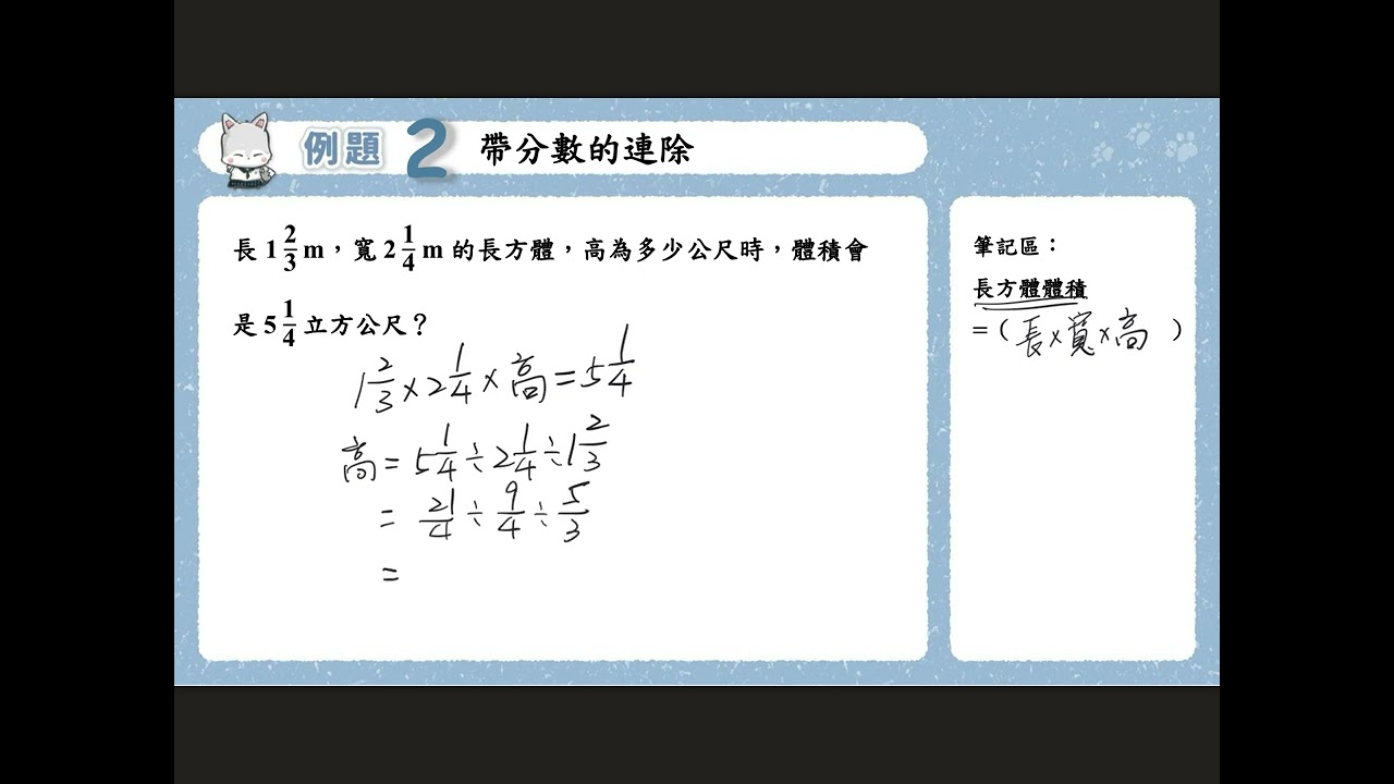 載入中... 相關課程 Back 例題2 帶分數的連除 相關課程 0 / 750 登入觀看 ⇐ Use this menu to view and help create subtitles for this video in many different languages. You'll probably want to hide YouTube's captions if using these subtitles. 例題2 帶分數的連除 上傳學習單 下載學習單