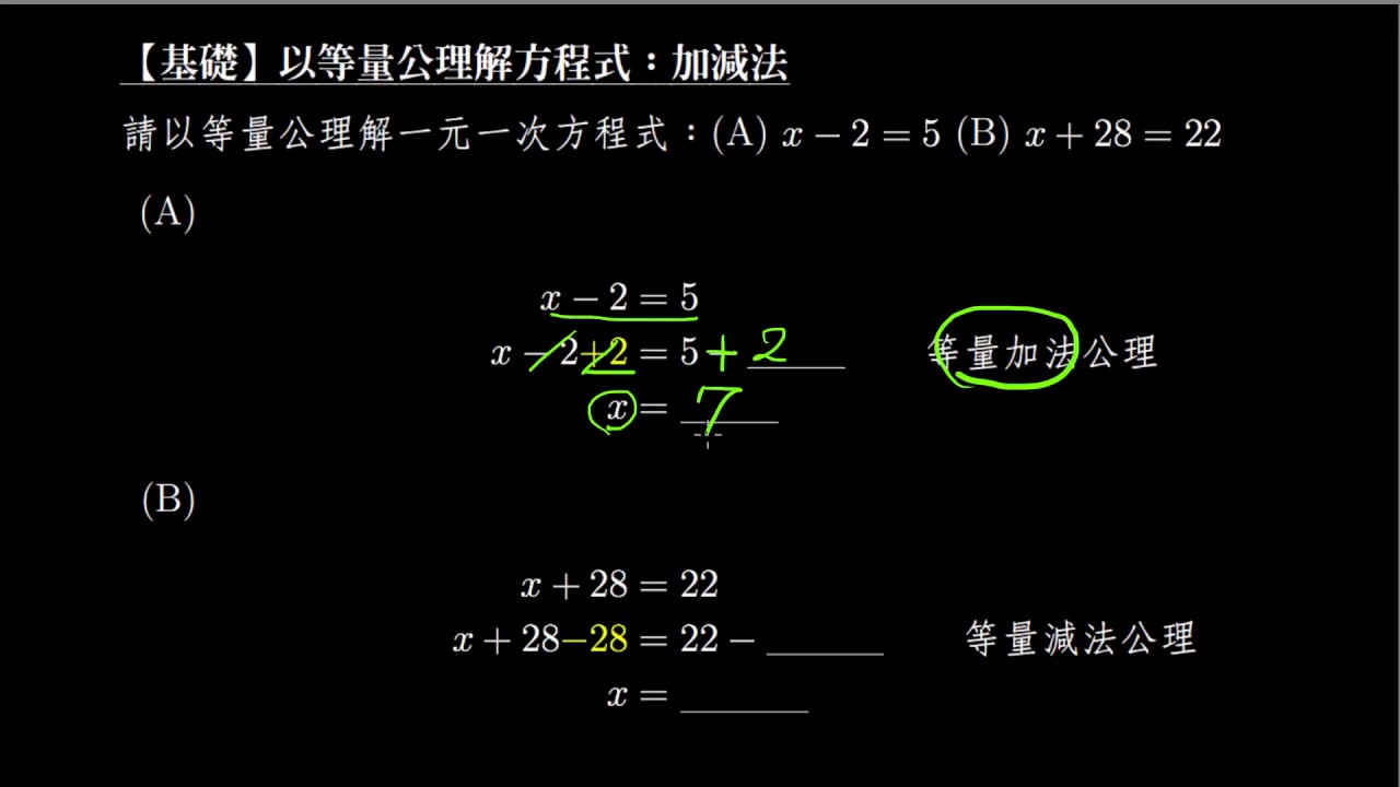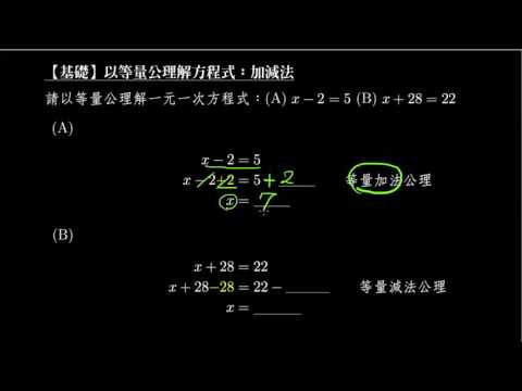 載入中... 相關課程 Back 【例題】用等量公理解方程式:加法、減法 相關課程 0 / 750 登入觀看 ⇐ Use this menu to view and help create subtitles for this video in many different languages. You'll probably want to hide YouTube's captions if using these subtitles. 【例題】用等量公理解方程式:加法、減法 上傳學習單 下載學習單