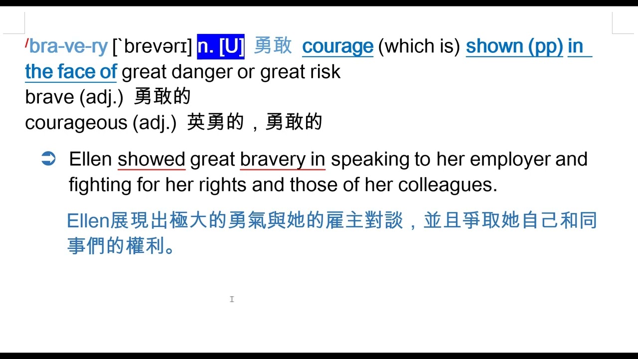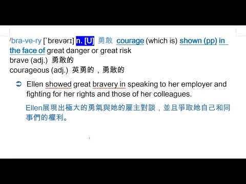 載入中... 相關課程 Back bravery [`brevərɪ] n. [U] 勇敢 相關課程 0 / 750 登入觀看 ⇐ Use this menu to view and help create subtitles for this video in many different languages. You'll probably want to hide YouTube's captions if using these subtitles. bravery [`brevərɪ] n. [U] 勇敢 上傳學習單 下載學習單