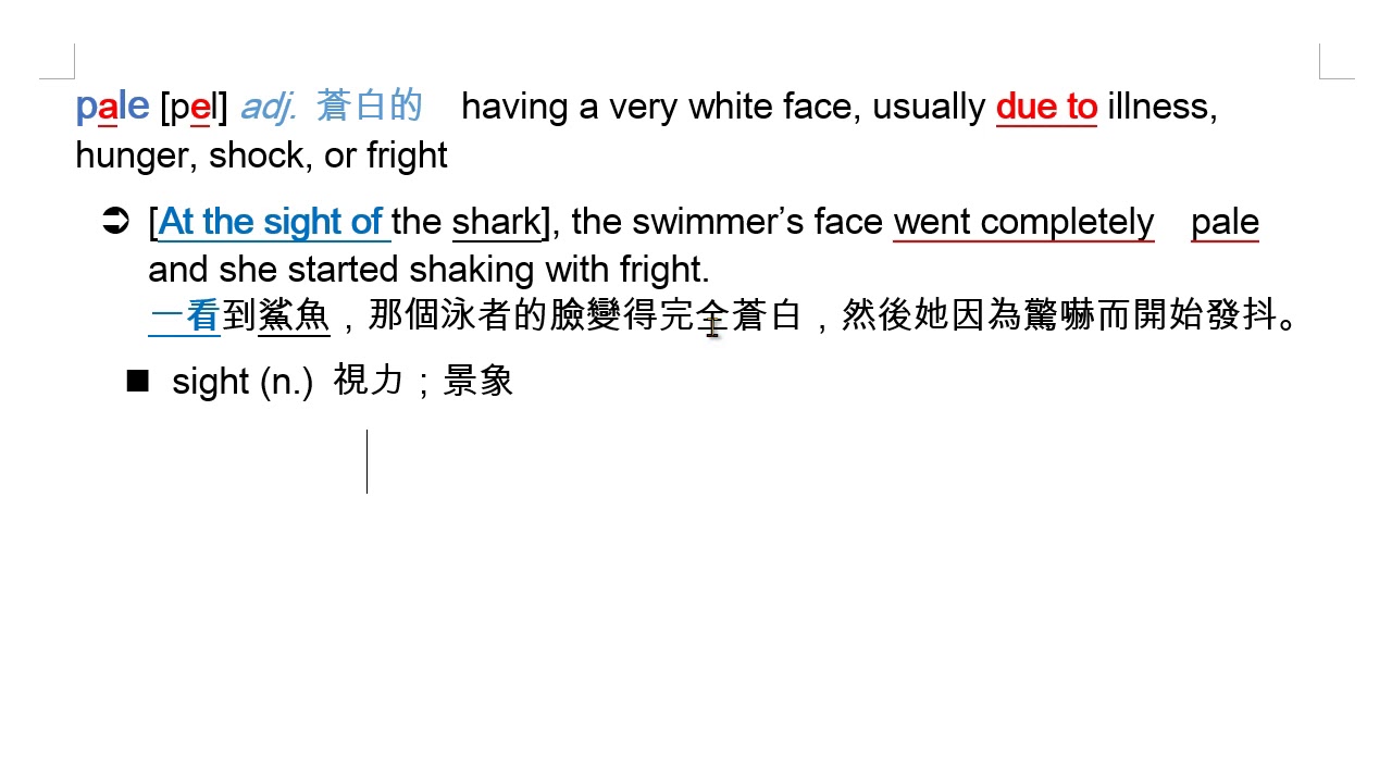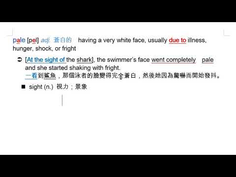 載入中... 相關課程 Back pale (adj.) 蒼白的 相關課程 0 / 750 登入觀看 ⇐ Use this menu to view and help create subtitles for this video in many different languages. You'll probably want to hide YouTube's captions if using these subtitles. pale (adj.) 蒼白的 上傳學習單 下載學習單