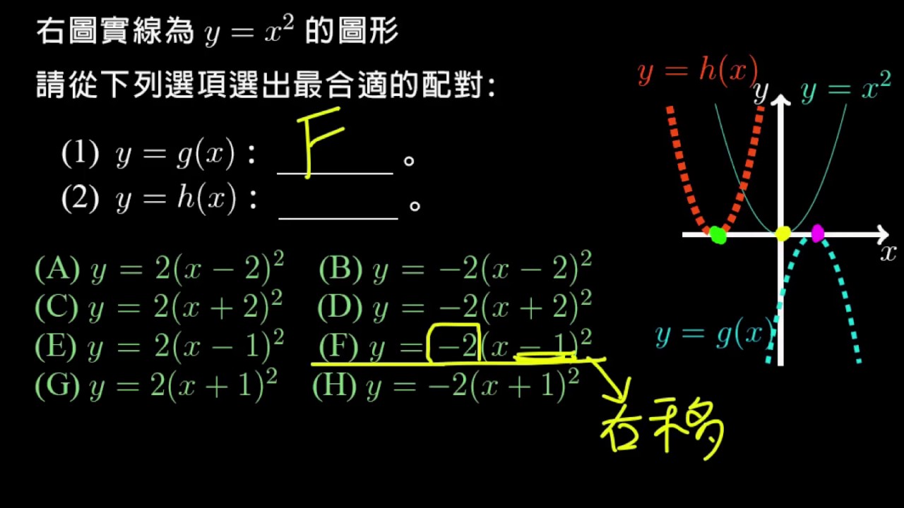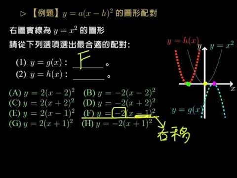 載入中... 相關課程 Back 【例題】y= a(x-h)^2 的圖形配對 相關課程 0 / 750 登入觀看 ⇐ Use this menu to view and help create subtitles for this video in many different languages. You'll probably want to hide YouTube's captions if using these subtitles. 【例題】y= a(x-h)^2 的圖形配對 上傳學習單 下載學習單