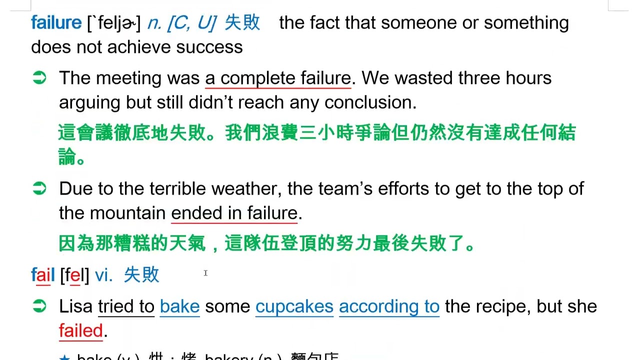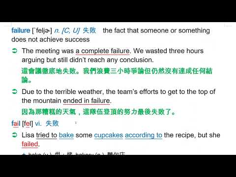 載入中... 相關課程 Back failure [`feljɚ] n. [C, U] 失敗 相關課程 0 / 750 登入觀看 ⇐ Use this menu to view and help create subtitles for this video in many different languages. You'll probably want to hide YouTube's captions if using these subtitles. failure [`feljɚ] n. [C, U] 失敗 上傳學習單 下載學習單