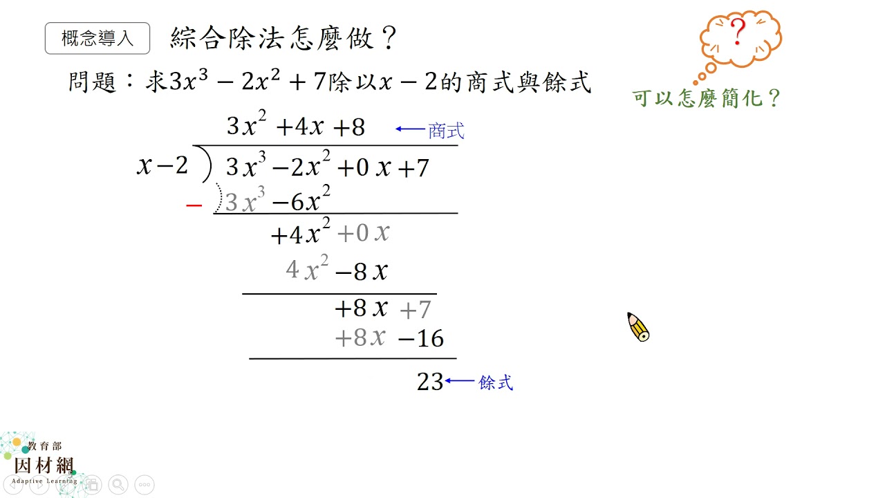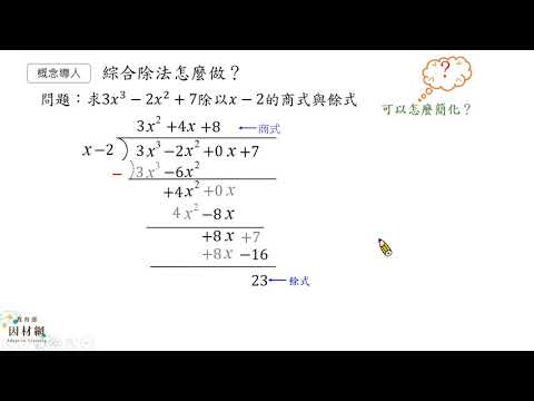 載入中... 相關課程 Back A-10-2-S02_能利用綜合除法做多項式除以x−a之運算 相關課程 0 / 750 登入觀看 ⇐ Use this menu to view and help create subtitles for this video in many different languages. You'll probably want to hide YouTube's captions if using these subtitles. A-10-2-S02_能利用綜合除法做多項式除以x−a之運算 上傳學習單 下載學習單
