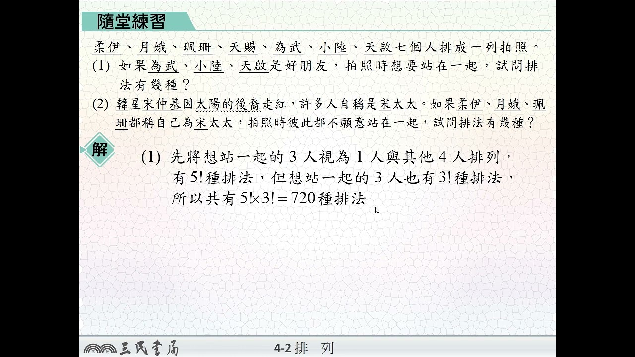 載入中... 相關課程 Back 【解題】相鄰與不相鄰的排列 相關課程 0 / 750 登入觀看 ⇐ Use this menu to view and help create subtitles for this video in many different languages. You'll probably want to hide YouTube's captions if using these subtitles. 【解題】相鄰與不相鄰的排列 上傳學習單 下載學習單