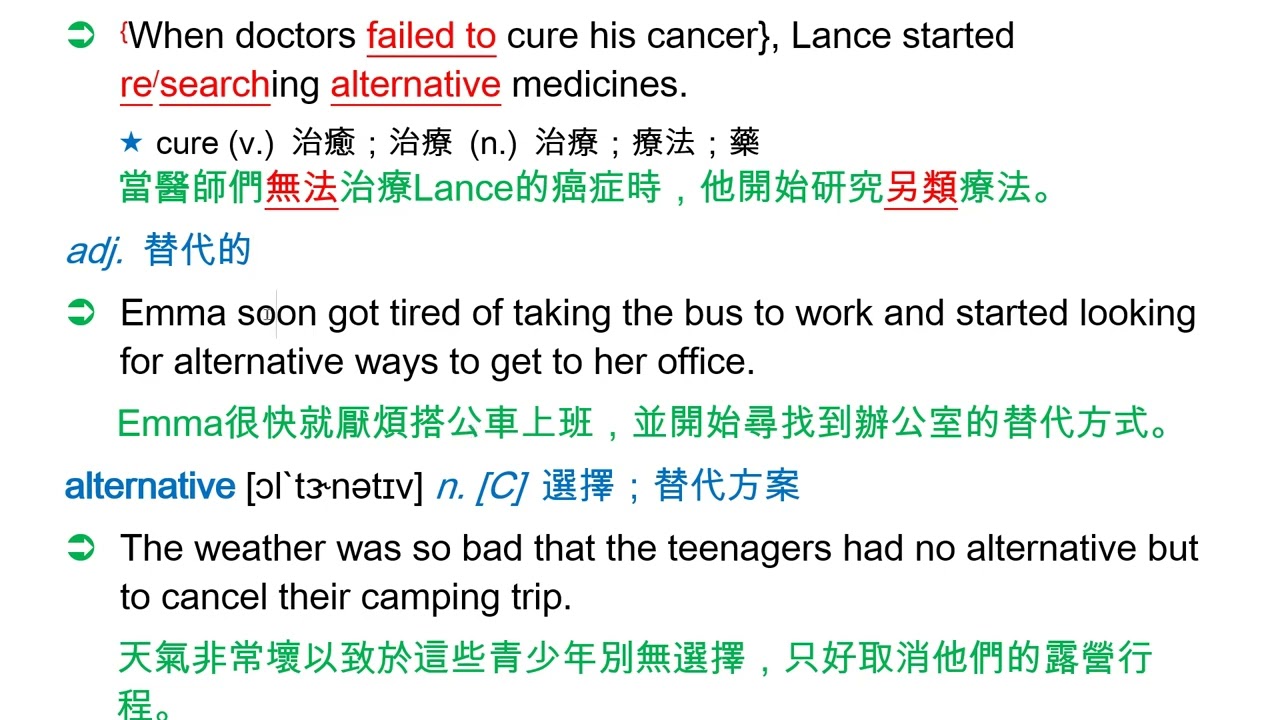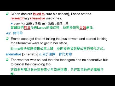 載入中... 相關課程 Back alternative [ɔl`tɝnətɪv] adj. 另類的;非傳統的 相關課程 0 / 750 登入觀看 ⇐ Use this menu to view and help create subtitles for this video in many different languages. You'll probably want to hide YouTube's captions if using these subtitles. alternative [ɔl`tɝnətɪv] adj. 另類的;非傳統的 上傳學習單 下載學習單