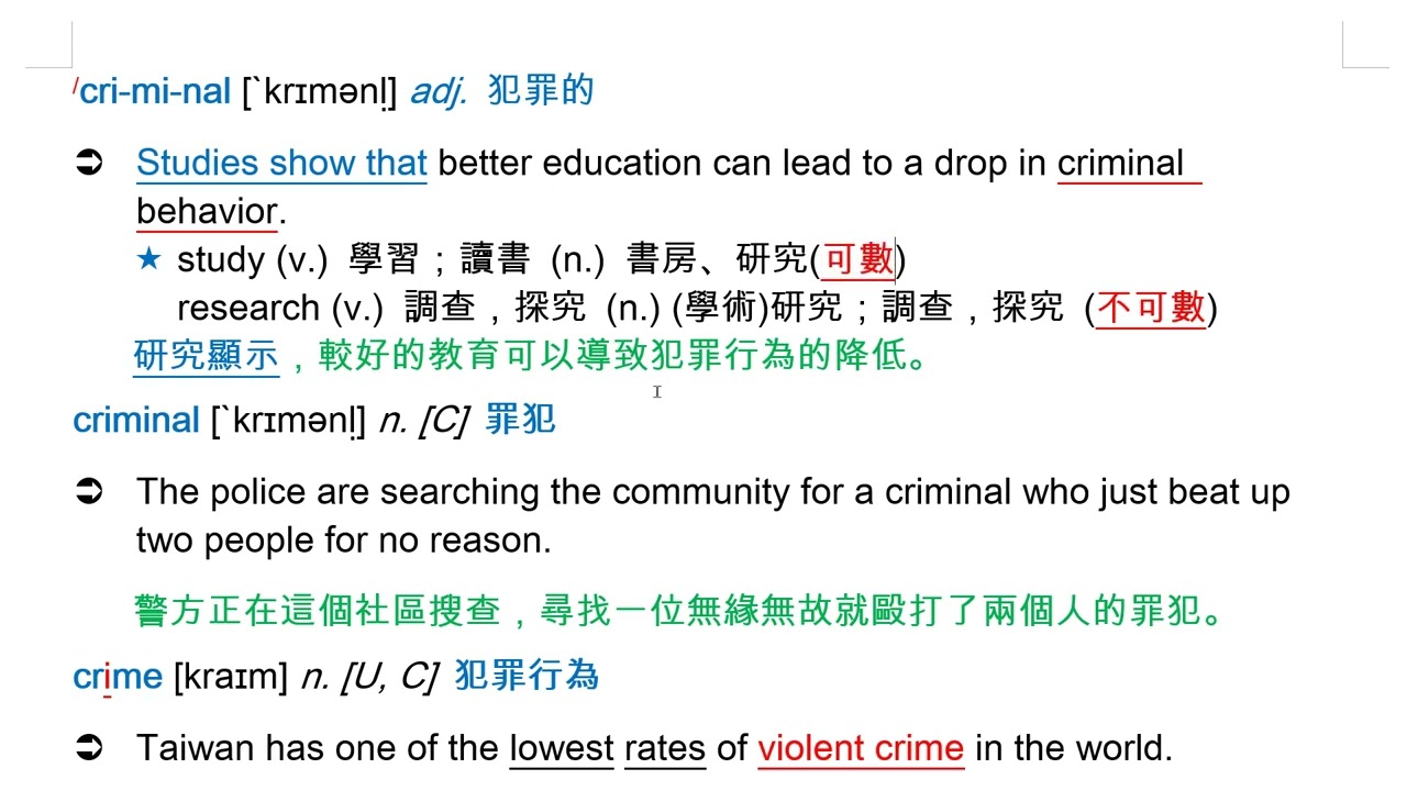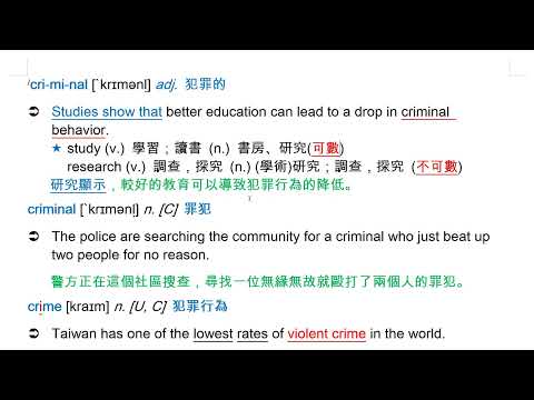 載入中... 相關課程 Back criminal [ˋkrɪmənḷ] adj. 犯罪的 相關課程 0 / 750 登入觀看 ⇐ Use this menu to view and help create subtitles for this video in many different languages. You'll probably want to hide YouTube's captions if using these subtitles. criminal [ˋkrɪmənḷ] adj. 犯罪的 上傳學習單 下載學習單