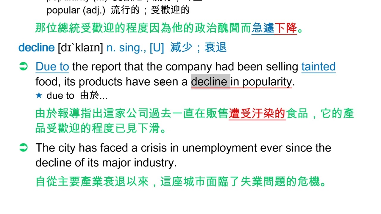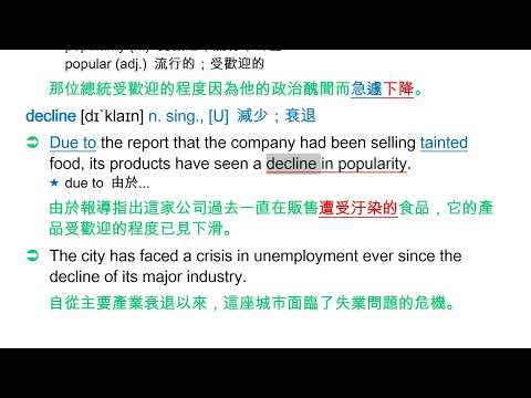 載入中... 相關課程 Back decline [dɪ`klaɪn] vi. 減少;衰退 相關課程 0 / 750 登入觀看 ⇐ Use this menu to view and help create subtitles for this video in many different languages. You'll probably want to hide YouTube's captions if using these subtitles. decline [dɪ`klaɪn] vi. 減少;衰退 上傳學習單 下載學習單