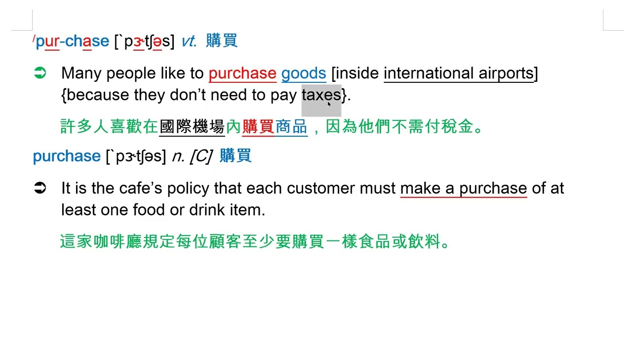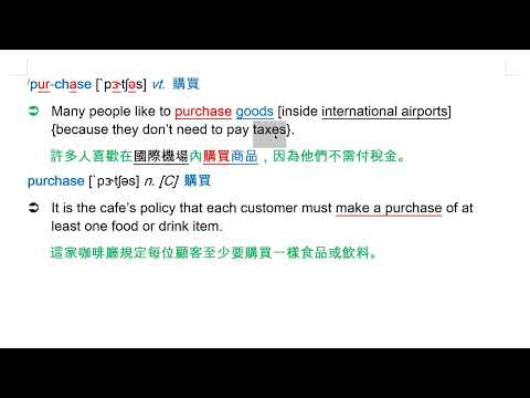 載入中... 相關課程 Back purchase [`pɝtʃəs] vt. 購買 相關課程 0 / 750 登入觀看 ⇐ Use this menu to view and help create subtitles for this video in many different languages. You'll probably want to hide YouTube's captions if using these subtitles. purchase [`pɝtʃəs] vt. 購買 上傳學習單 下載學習單