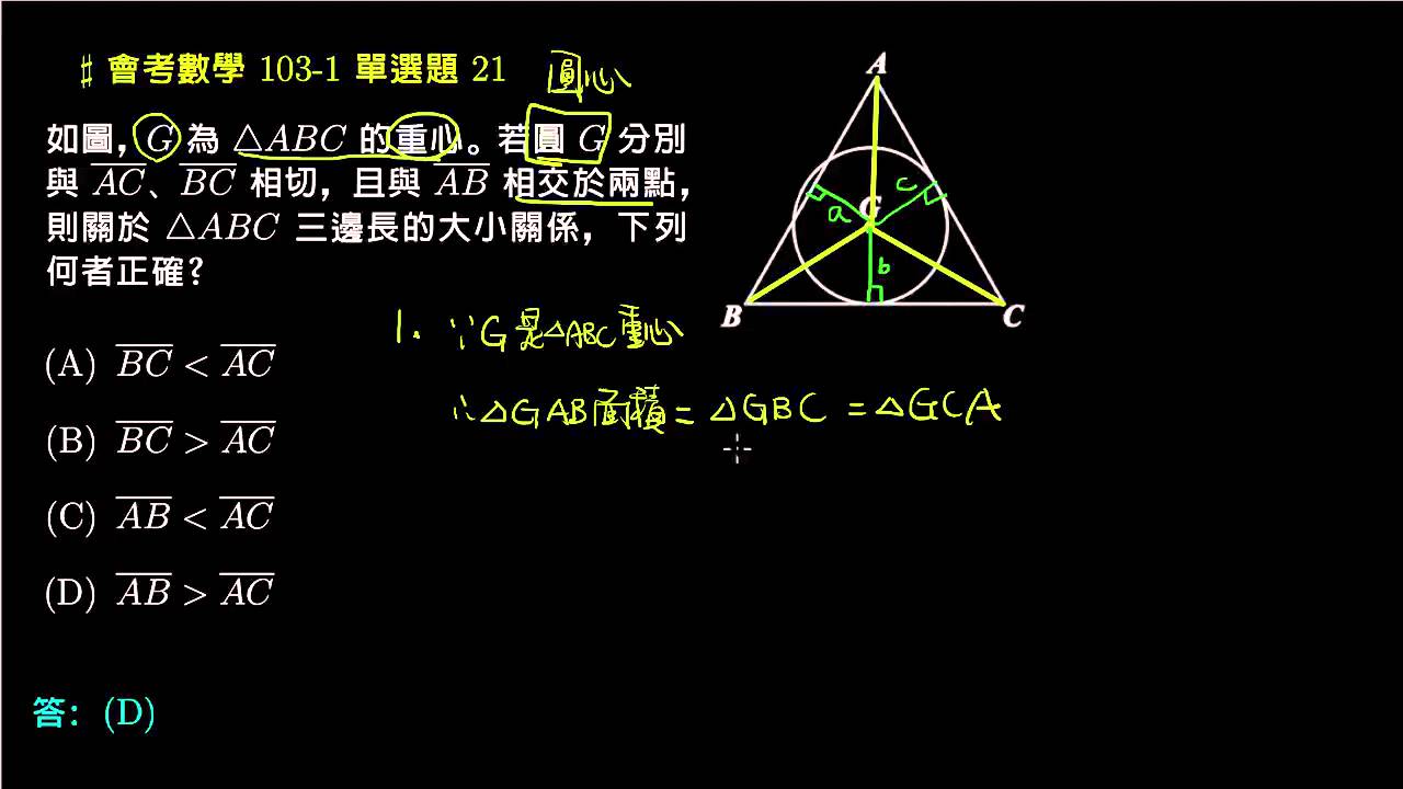 載入中... 相關課程 Back 【會考數學】103v1 單選21:三角形的重心和直線與圓的距離 相關課程 0 / 750 登入觀看 ⇐ Use this menu to view and help create subtitles for this video in many different languages. You'll probably want to hide YouTube's captions if using these subtitles. 【會考數學】103v1 單選21:三角形的重心和直線與圓的距離 上傳學習單 下載學習單