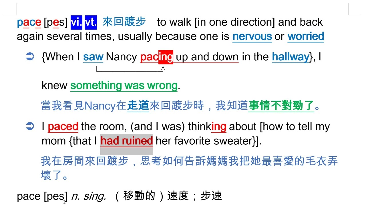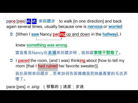 載入中... 相關課程 Back pace [pes] vi. vt. 來回踱步 相關課程 0 / 750 登入觀看 ⇐ Use this menu to view and help create subtitles for this video in many different languages. You'll probably want to hide YouTube's captions if using these subtitles. pace [pes] vi. vt. 來回踱步 上傳學習單 下載學習單