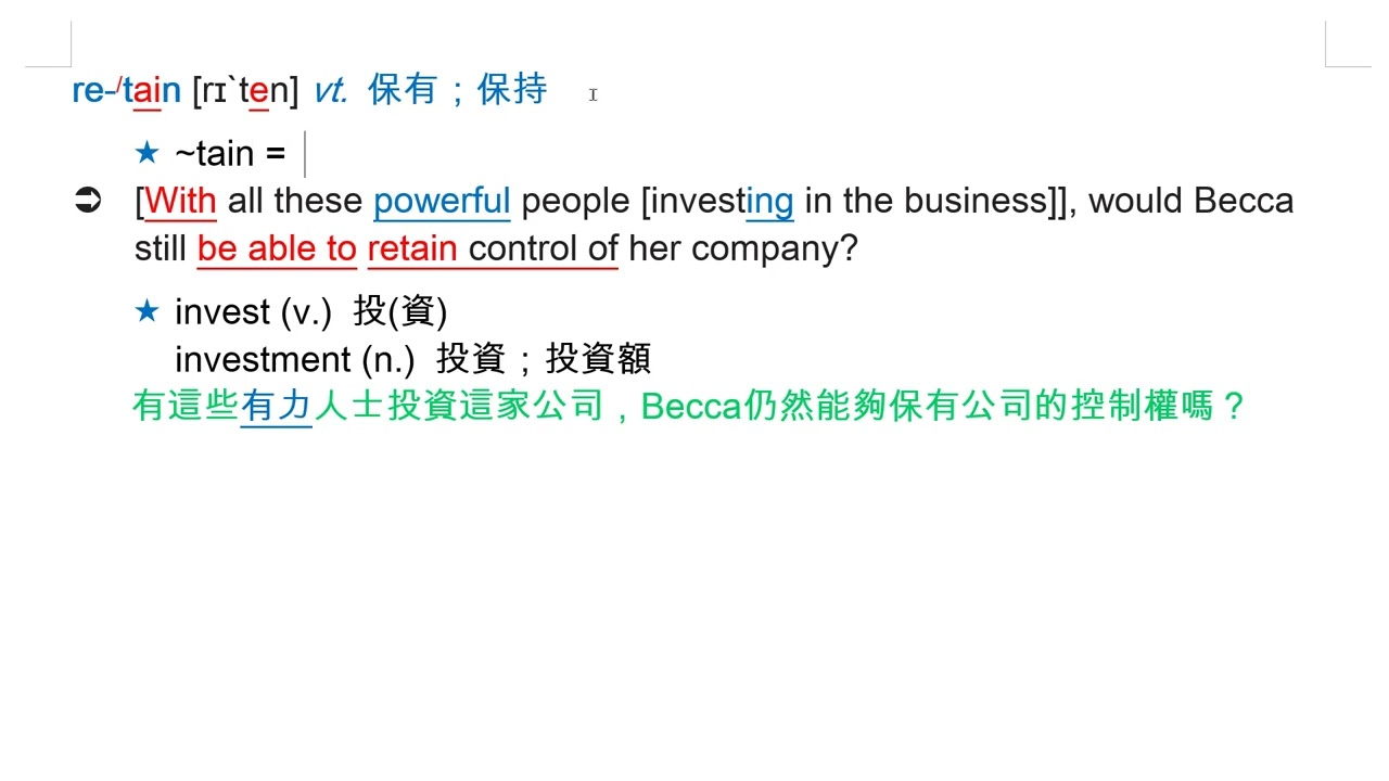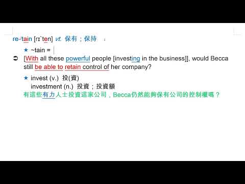 載入中... 相關課程 Back retain [rɪ`ten] vt. 保有;保持 相關課程 0 / 750 登入觀看 ⇐ Use this menu to view and help create subtitles for this video in many different languages. You'll probably want to hide YouTube's captions if using these subtitles. retain [rɪ`ten] vt. 保有;保持 上傳學習單 下載學習單