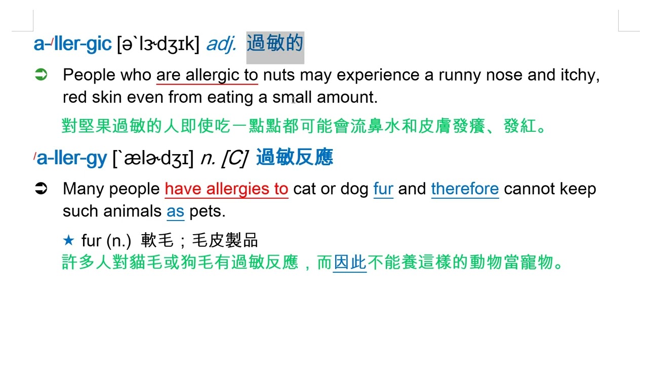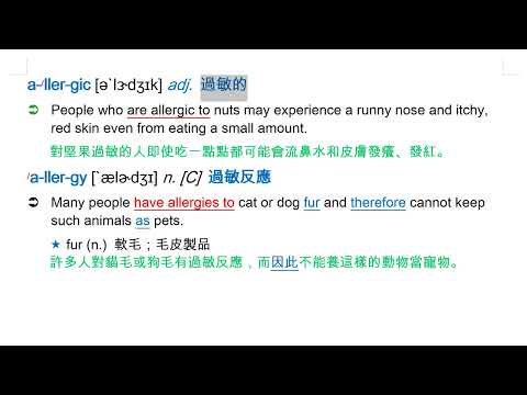載入中... 相關課程 Back allergic [ə`lɝdʒɪk] adj. 過敏的 相關課程 0 / 750 登入觀看 ⇐ Use this menu to view and help create subtitles for this video in many different languages. You'll probably want to hide YouTube's captions if using these subtitles. allergic [ə`lɝdʒɪk] adj. 過敏的 上傳學習單 下載學習單