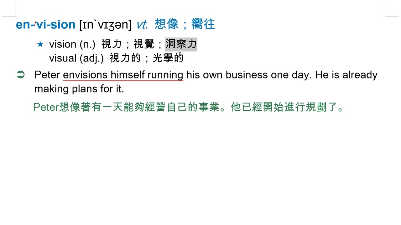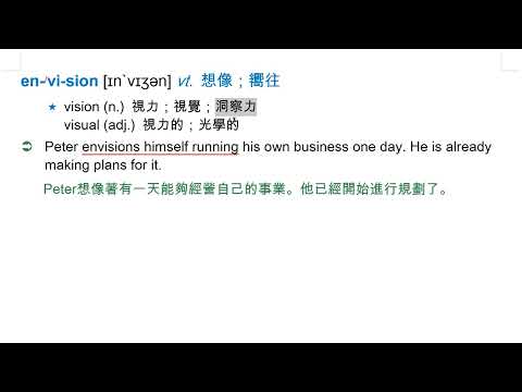 載入中... 相關課程 Back envision [ɪn`vɪʒən] vt. 想像;嚮往 相關課程 0 / 750 登入觀看 envision [ɪn`vɪʒən] vt. 想像;嚮往 上傳學習單 下載學習單