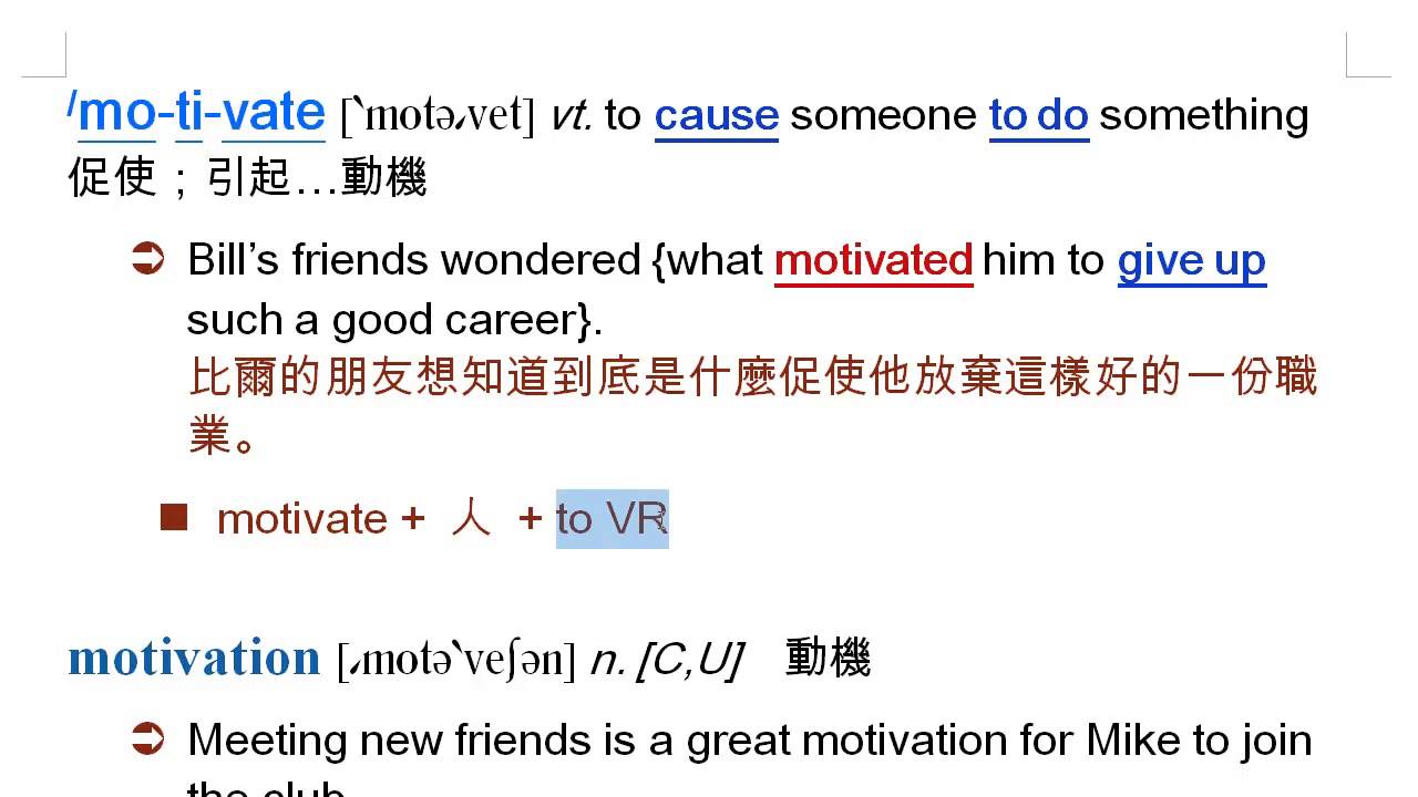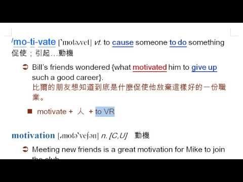 載入中... 相關課程 Back motivate: 促使, 引起...動機, motivation, 動機 相關課程 0 / 750 登入觀看 ⇐ Use this menu to view and help create subtitles for this video in many different languages. You'll probably want to hide YouTube's captions if using these subtitles. motivate: 促使, 引起...動機, motivation, 動機 上傳學習單 下載學習單