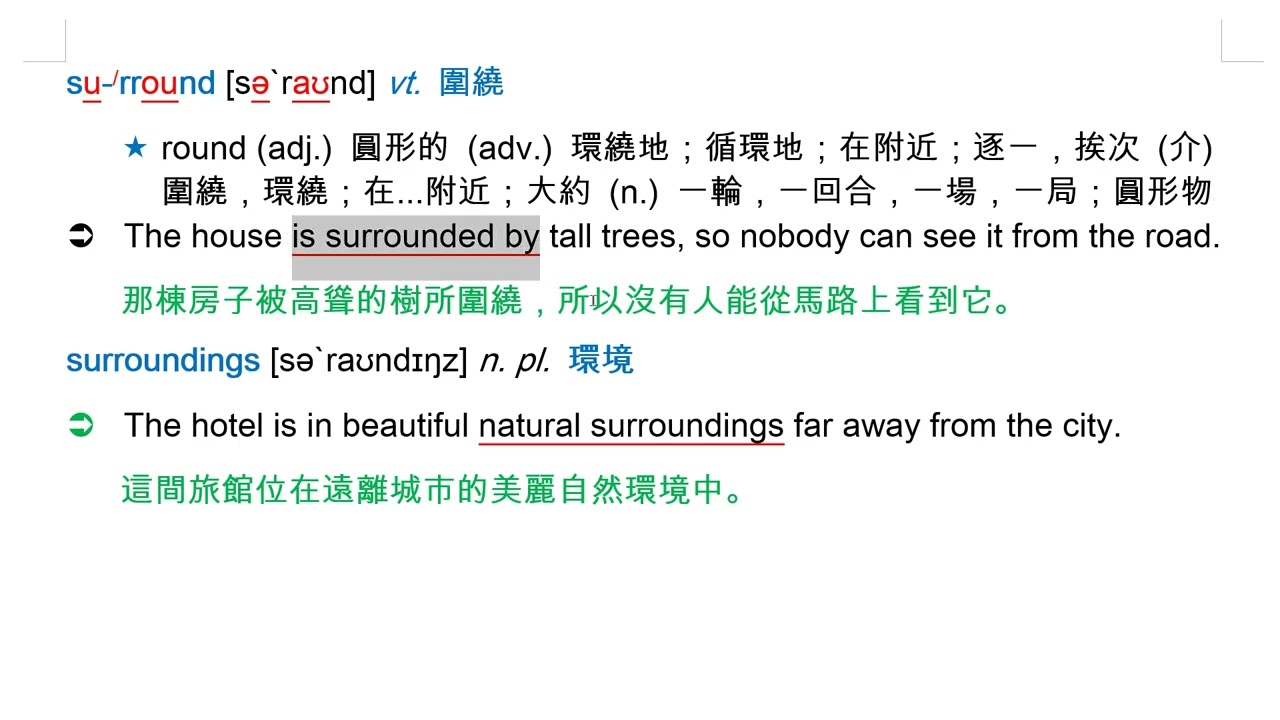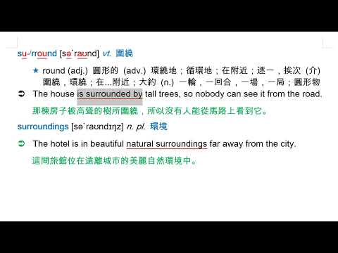 載入中... 相關課程 Back surround [sə`raʊnd] vt. 圍繞 相關課程 0 / 750 登入觀看 ⇐ Use this menu to view and help create subtitles for this video in many different languages. You'll probably want to hide YouTube's captions if using these subtitles. surround [sə`raʊnd] vt. 圍繞 上傳學習單 下載學習單