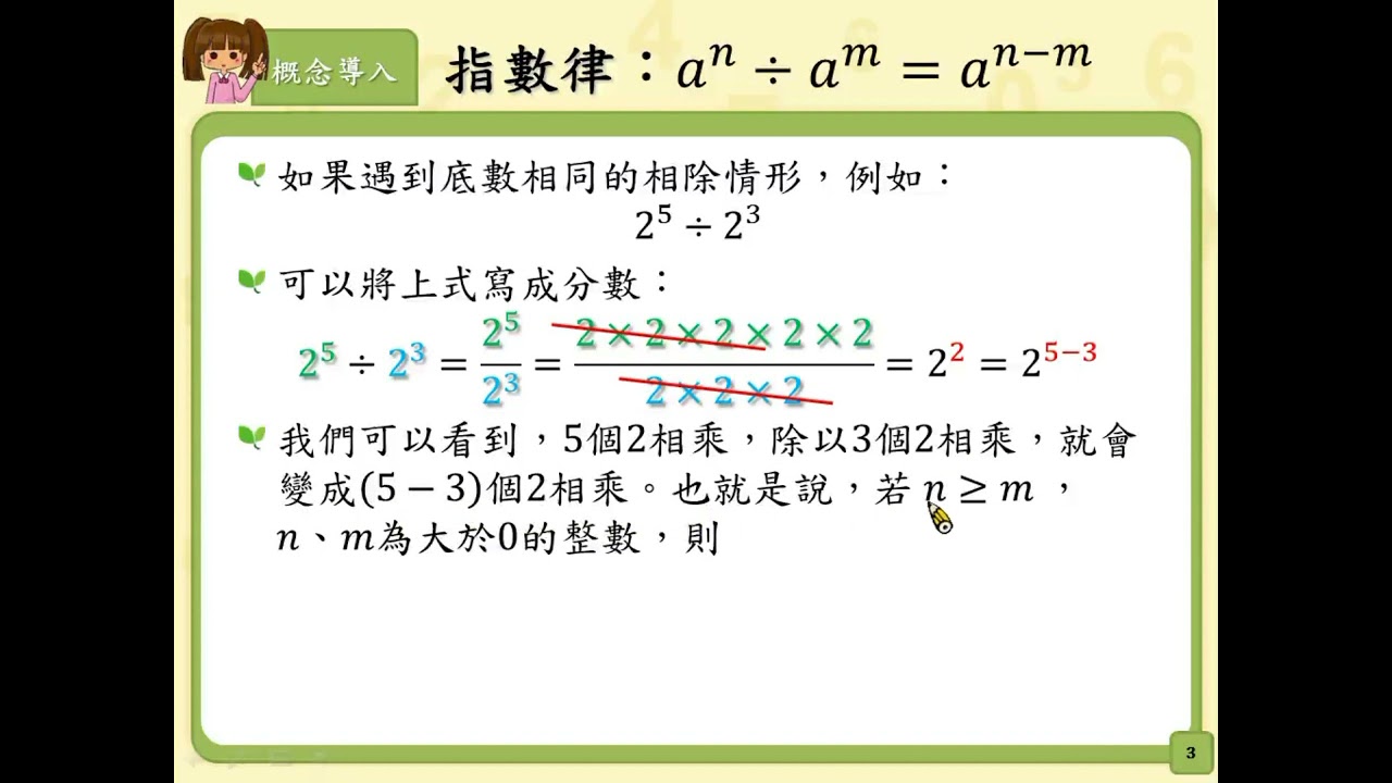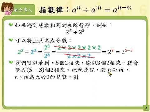 載入中... 相關課程 Back N-7-7-S04_能理解除法的指數律:an÷am = an-m,其中a ≠ 0,n ≥ m 。 相關課程 0 / 750 登入觀看 ⇐ Use this menu to view and help create subtitles for this video in many different languages. You'll probably want to hide YouTube's captions if using these subtitles. N-7-7-S04_能理解除法的指數律:an÷am = an-m,其中a ≠ 0,n ≥ m 。 上傳學習單 下載學習單