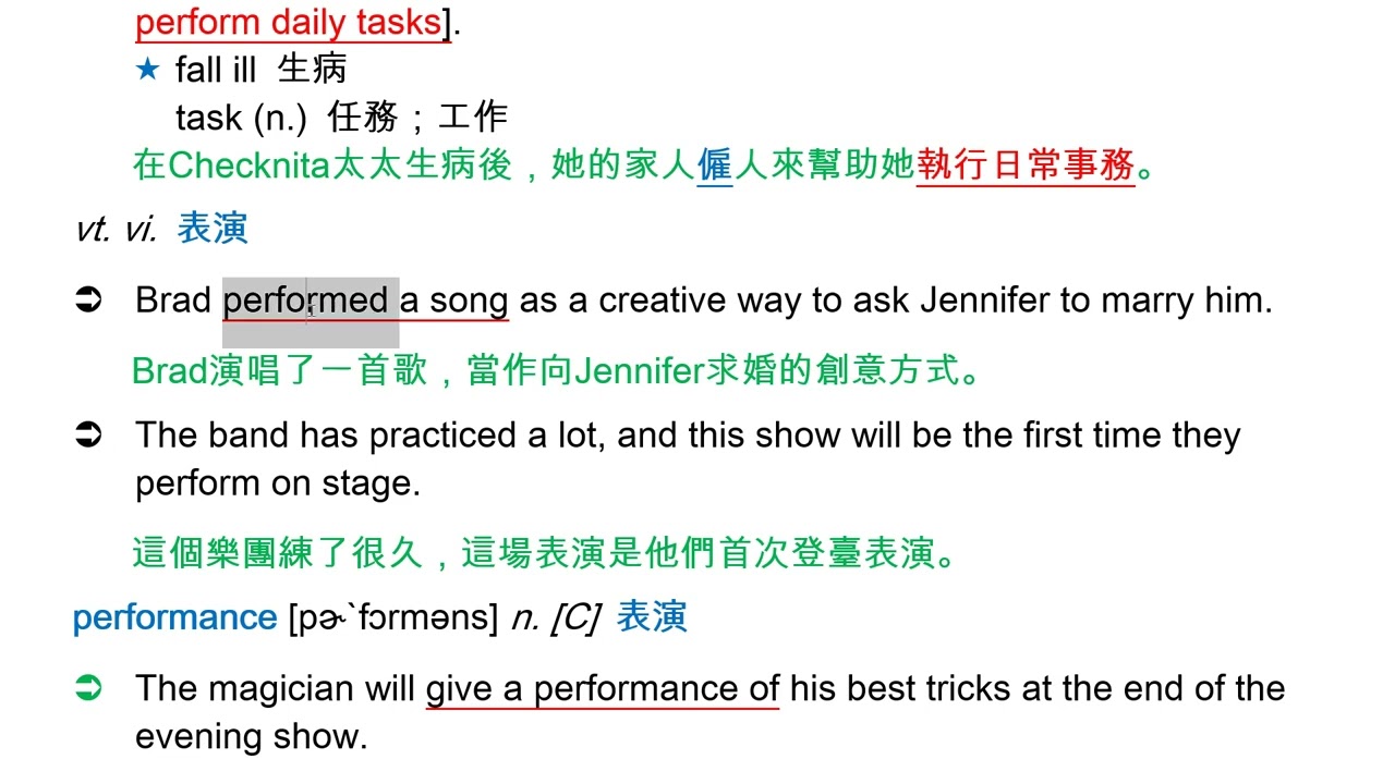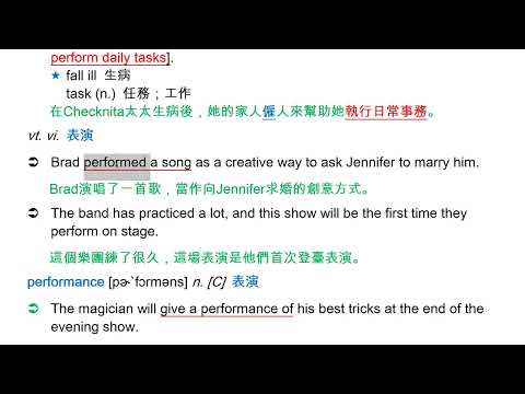 載入中... 相關課程 Back perform [pɚ`fɔrm] vt. 做某事;做某種行為 相關課程 0 / 750 登入觀看 ⇐ Use this menu to view and help create subtitles for this video in many different languages. You'll probably want to hide YouTube's captions if using these subtitles. perform [pɚ`fɔrm] vt. 做某事;做某種行為 上傳學習單 下載學習單