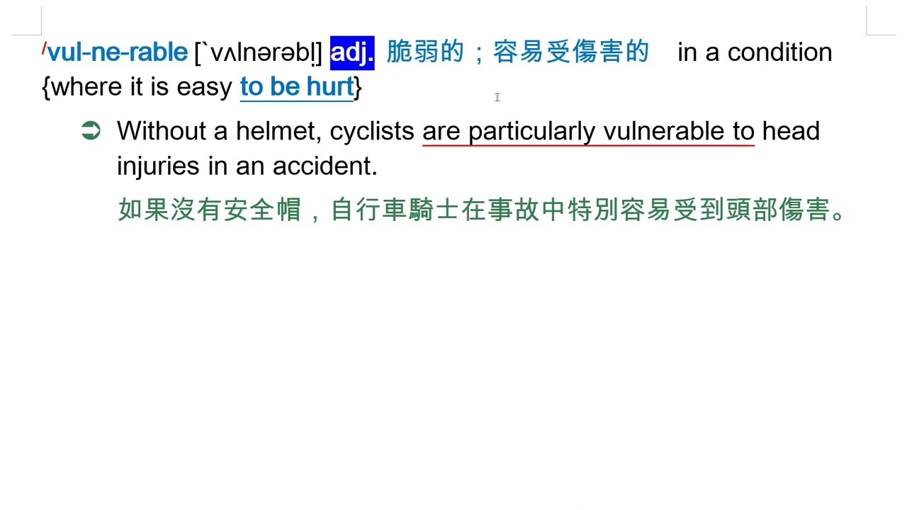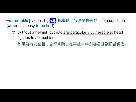 載入中... 相關課程 Back vulnerable [`vʌlnərəbḷ] adj. 脆弱的;容易受傷害的 相關課程 0 / 750 登入觀看 ⇐ Use this menu to view and help create subtitles for this video in many different languages. You'll probably want to hide YouTube's captions if using these subtitles. vulnerable [`vʌlnərəbḷ] adj. 脆弱的;容易受傷害的 上傳學習單 下載學習單