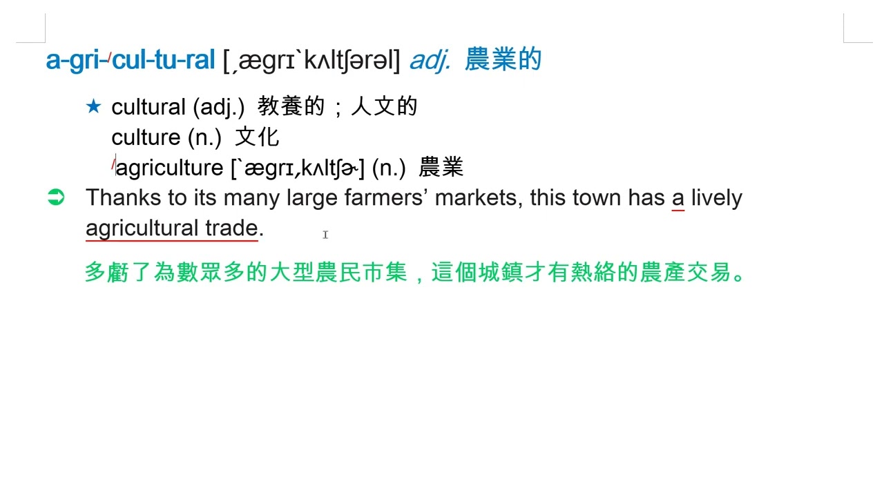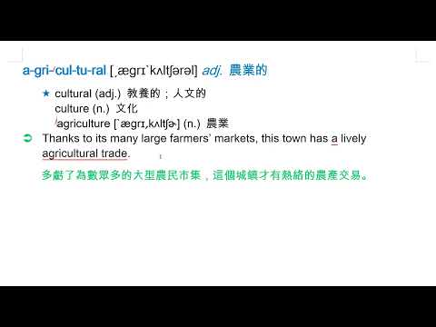 載入中... 相關課程 Back agricultural [ˏægrɪ`kʌltʃərəl] adj. 農業的 相關課程 0 / 750 登入觀看 ⇐ Use this menu to view and help create subtitles for this video in many different languages. You'll probably want to hide YouTube's captions if using these subtitles. agricultural [ˏægrɪ`kʌltʃərəl] adj. 農業的 上傳學習單 下載學習單
