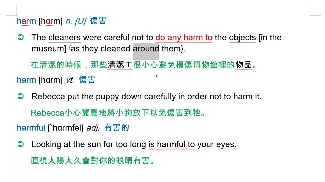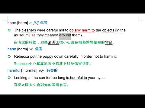 載入中... 相關課程 Back harm [hɑrm] n. [U] 傷害 相關課程 0 / 750 登入觀看 ⇐ Use this menu to view and help create subtitles for this video in many different languages. You'll probably want to hide YouTube's captions if using these subtitles. harm [hɑrm] n. [U] 傷害 上傳學習單 下載學習單
