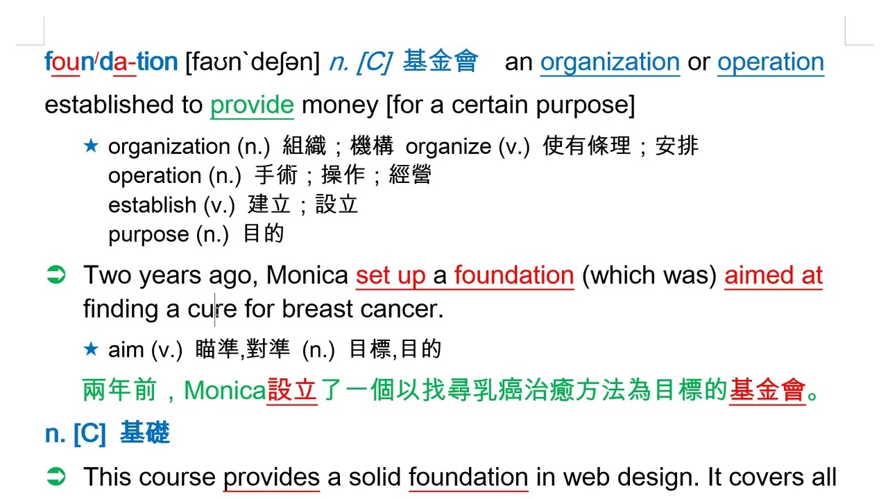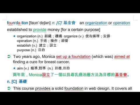 載入中... 相關課程 Back foundation [faʊn`deʃən] n. [C] 基金會 相關課程 0 / 750 登入觀看 ⇐ Use this menu to view and help create subtitles for this video in many different languages. You'll probably want to hide YouTube's captions if using these subtitles. foundation [faʊn`deʃən] n. [C] 基金會 上傳學習單 下載學習單