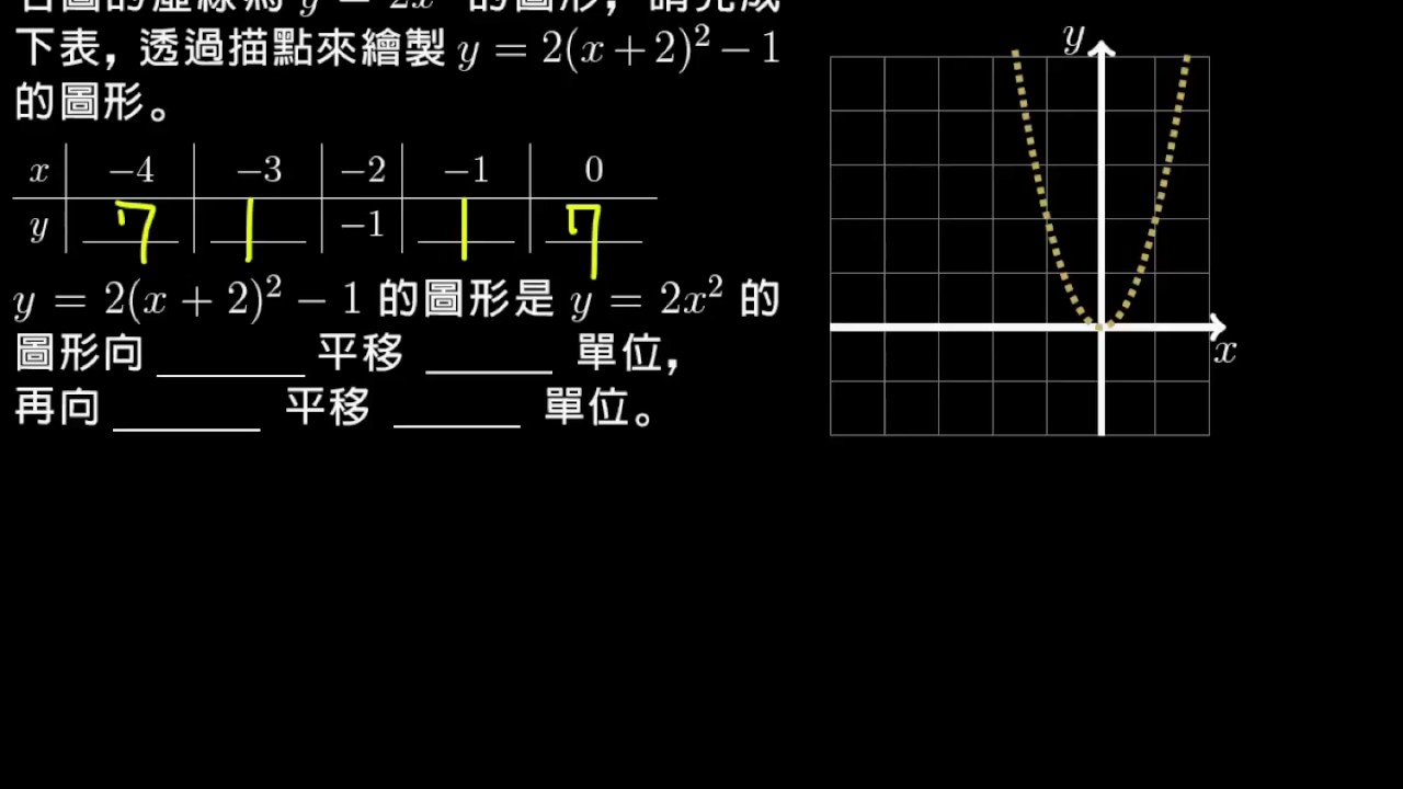 載入中... 相關課程 Back 【例題】描繪 y= 2(x+2)^2-1 的圖形 相關課程 0 / 750 登入觀看 ⇐ Use this menu to view and help create subtitles for this video in many different languages. You'll probably want to hide YouTube's captions if using these subtitles. 【例題】描繪 y= 2(x+2)^2-1 的圖形 上傳學習單 下載學習單