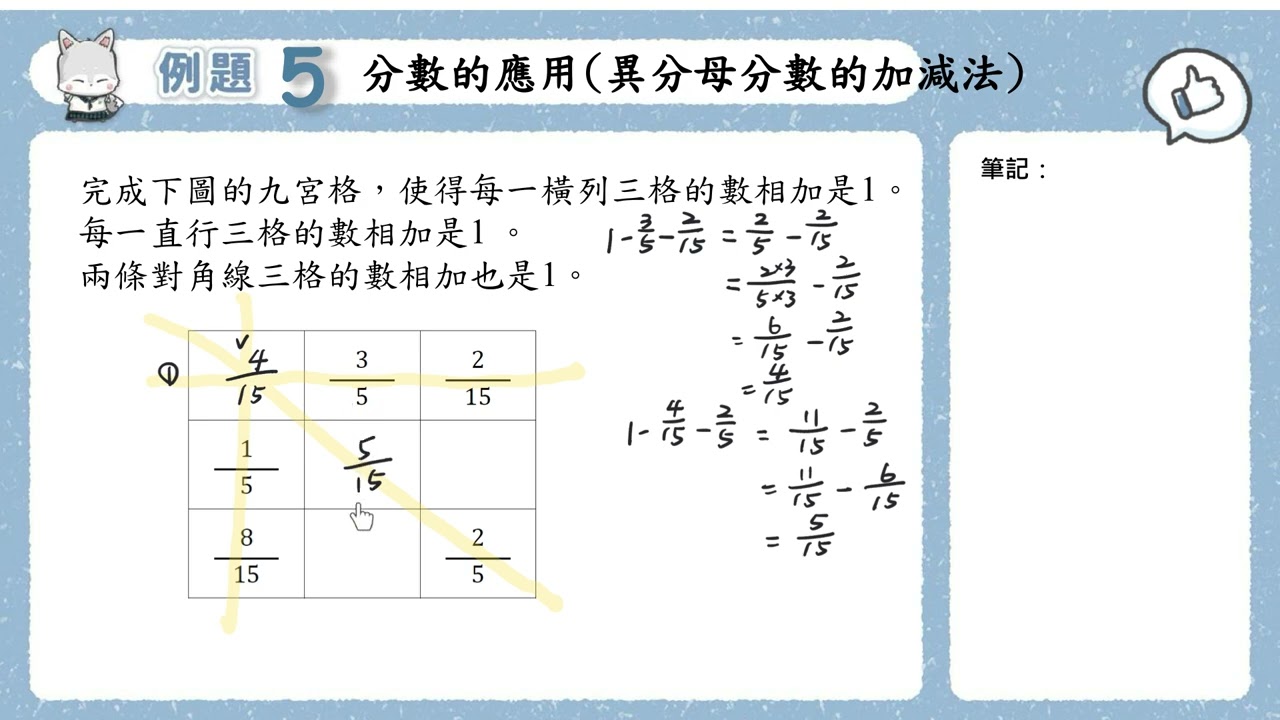 載入中... 相關課程 Back 五上 單元6 16 例題5 分數的應用(異分母分數的加減法) 相關課程 0 / 750 登入觀看 ⇐ Use this menu to view and help create subtitles for this video in many different languages. You'll probably want to hide YouTube's captions if using these subtitles. 五上 單元6 16 例題5 分數的應用(異分母分數的加減法) 上傳學習單 下載學習單
