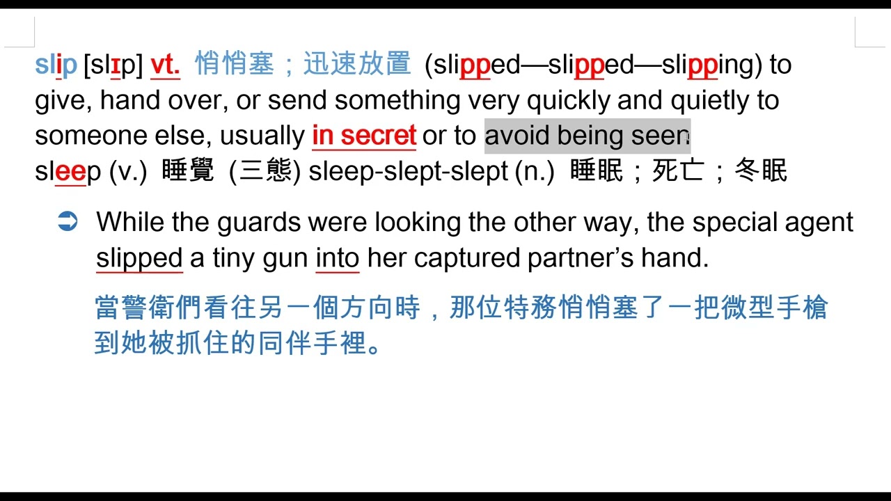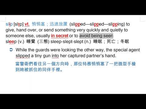 載入中... 相關課程 Back slip [slɪp] vt. 悄悄塞;迅速放置 相關課程 0 / 750 登入觀看 ⇐ Use this menu to view and help create subtitles for this video in many different languages. You'll probably want to hide YouTube's captions if using these subtitles. slip [slɪp] vt. 悄悄塞;迅速放置 上傳學習單 下載學習單