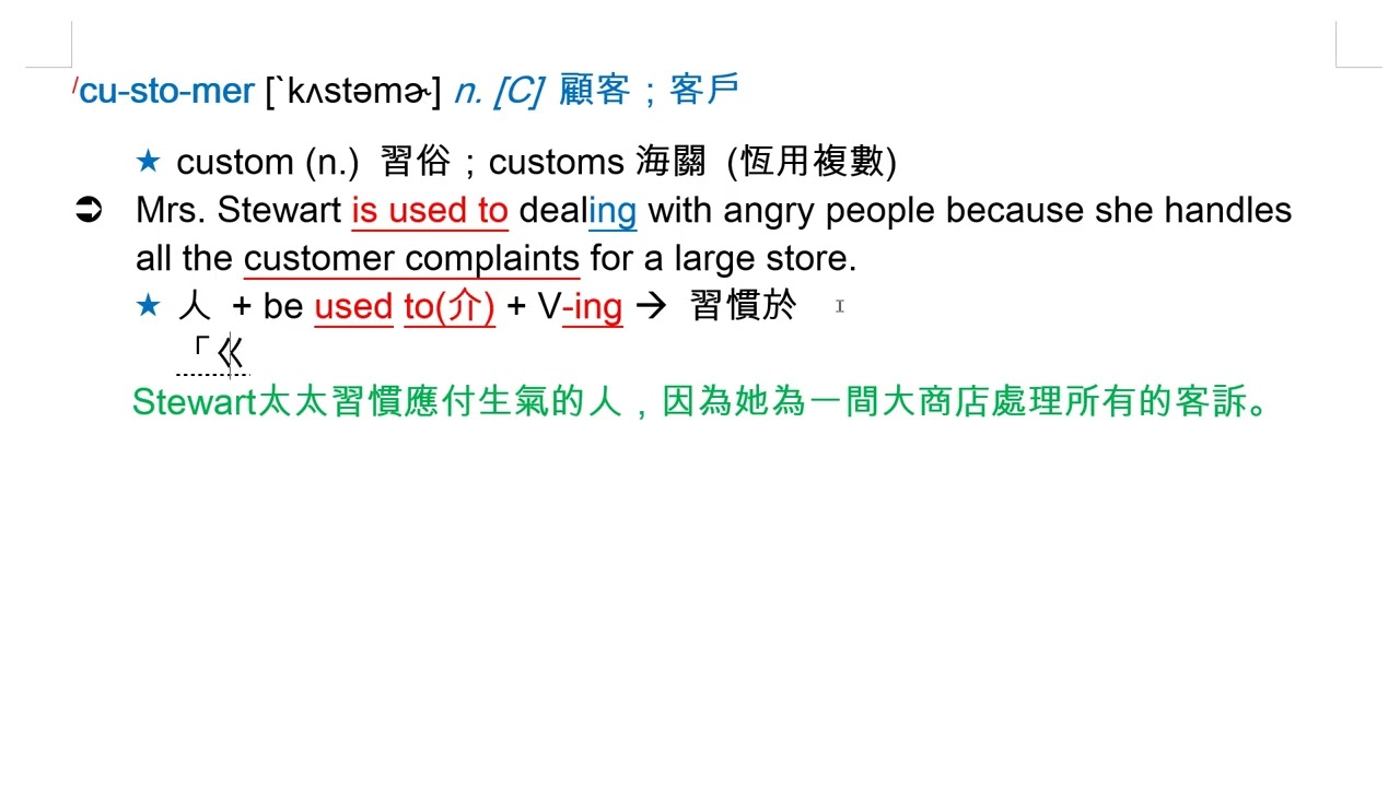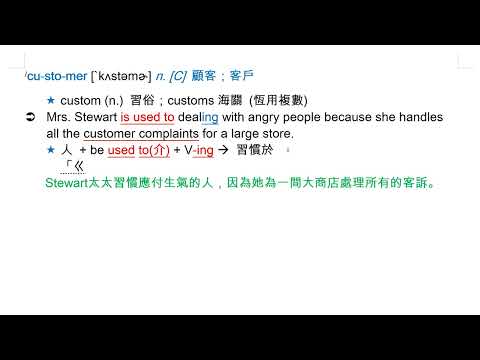 載入中... 相關課程 Back customer [`kʌstəmɚ] n. [C] 顧客;客戶 相關課程 0 / 750 登入觀看 ⇐ Use this menu to view and help create subtitles for this video in many different languages. You'll probably want to hide YouTube's captions if using these subtitles. customer [`kʌstəmɚ] n. [C] 顧客;客戶 上傳學習單 下載學習單