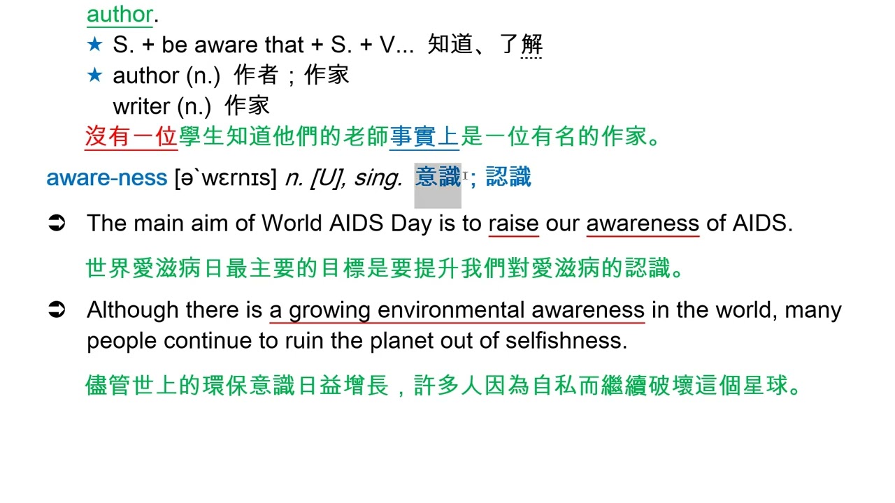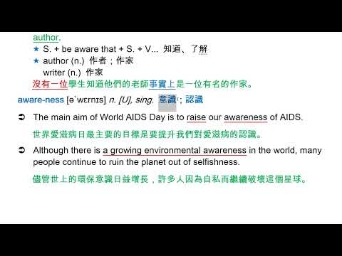 載入中... 相關課程 Back aware [ə`wɛr] adj. 知道;意識到 相關課程 0 / 750 登入觀看 ⇐ Use this menu to view and help create subtitles for this video in many different languages. You'll probably want to hide YouTube's captions if using these subtitles. aware [ə`wɛr] adj. 知道;意識到 上傳學習單 下載學習單