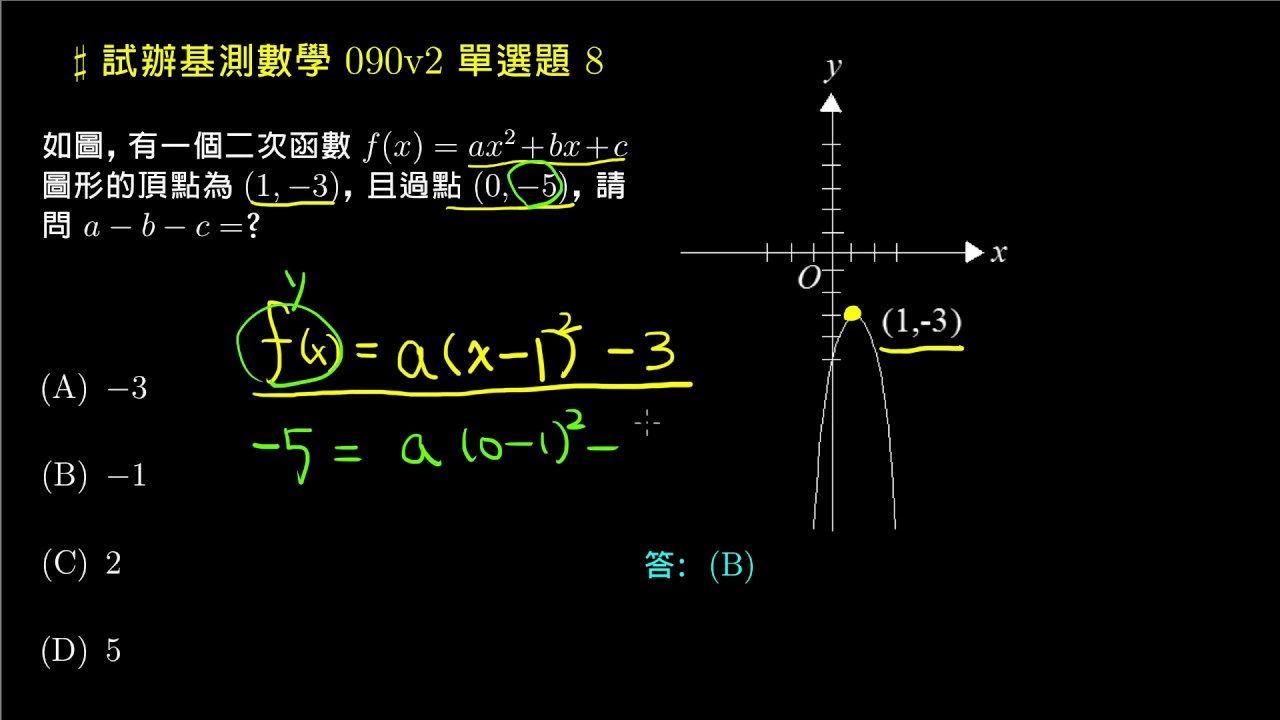 載入中... 相關課程 Back 【基測數學練習題本】90v2 單選08:二次函數的頂點 相關課程 0 / 750 登入觀看 ⇐ Use this menu to view and help create subtitles for this video in many different languages. You'll probably want to hide YouTube's captions if using these subtitles. 【基測數學練習題本】90v2 單選08:二次函數的頂點 上傳學習單 下載學習單