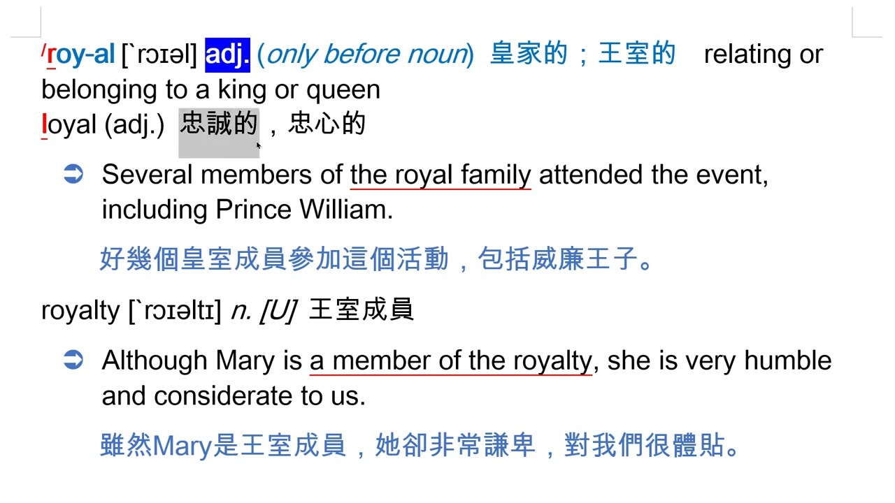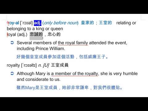 載入中... 相關課程 Back royal [`rɔɪəl] adj. (only before noun) 皇家的;王室的 相關課程 0 / 750 登入觀看 ⇐ Use this menu to view and help create subtitles for this video in many different languages. You'll probably want to hide YouTube's captions if using these subtitles. royal [`rɔɪəl] adj. (only before noun) 皇家的;王室的 上傳學習單 下載學習單