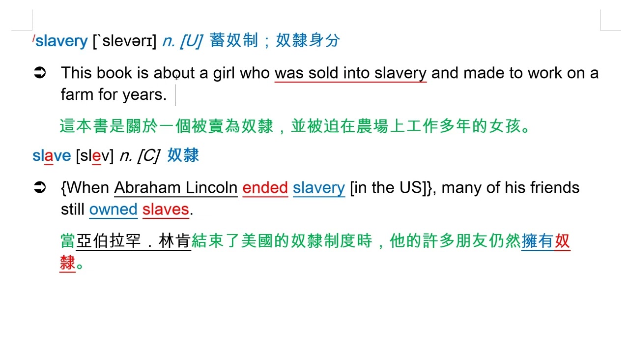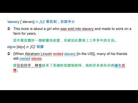 載入中... 相關課程 Back slavery [`slevərɪ] n. [U] 蓄奴制;奴隸身分 相關課程 0 / 750 登入觀看 ⇐ Use this menu to view and help create subtitles for this video in many different languages. You'll probably want to hide YouTube's captions if using these subtitles. slavery [`slevərɪ] n. [U] 蓄奴制;奴隸身分 上傳學習單 下載學習單