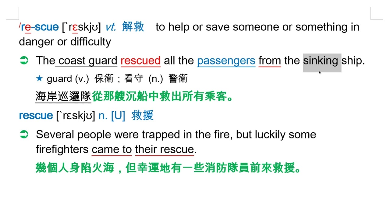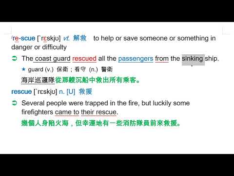 載入中... 相關課程 Back rescue [`rɛskjʊ] vt. 解救 相關課程 0 / 750 登入觀看 ⇐ Use this menu to view and help create subtitles for this video in many different languages. You'll probably want to hide YouTube's captions if using these subtitles. rescue [`rɛskjʊ] vt. 解救 上傳學習單 下載學習單