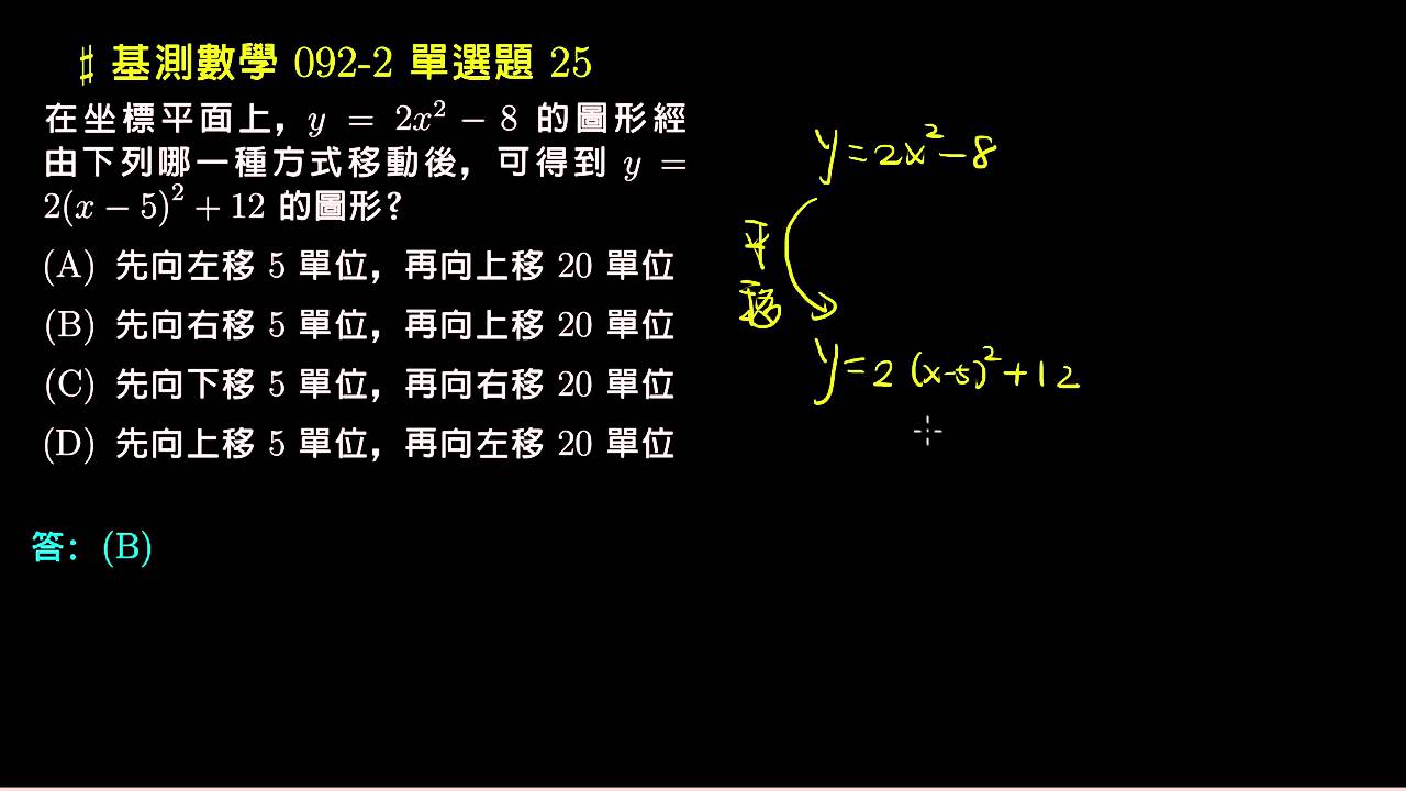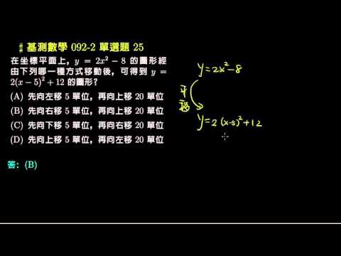 載入中... 相關課程 Back 【基測數學】92v2 單選25:二次函數的平移 相關課程 0 / 750 登入觀看 ⇐ Use this menu to view and help create subtitles for this video in many different languages. You'll probably want to hide YouTube's captions if using these subtitles. 【基測數學】92v2 單選25:二次函數的平移 上傳學習單 下載學習單