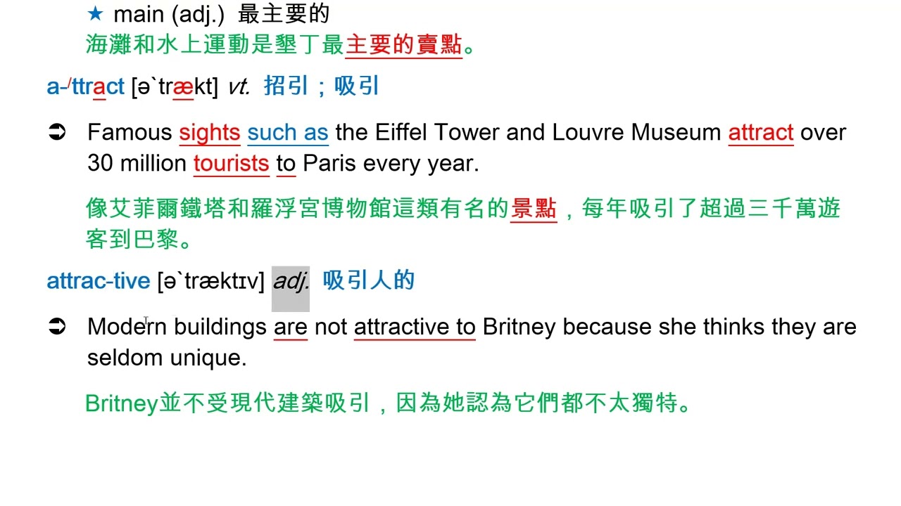 載入中... 相關課程 Back attraction [ə`trækʃən] n. [C] 有吸引力的事物或地點 相關課程 0 / 750 登入觀看 ⇐ Use this menu to view and help create subtitles for this video in many different languages. You'll probably want to hide YouTube's captions if using these subtitles. attraction [ə`trækʃən] n. [C] 有吸引力的事物或地點 上傳學習單 下載學習單