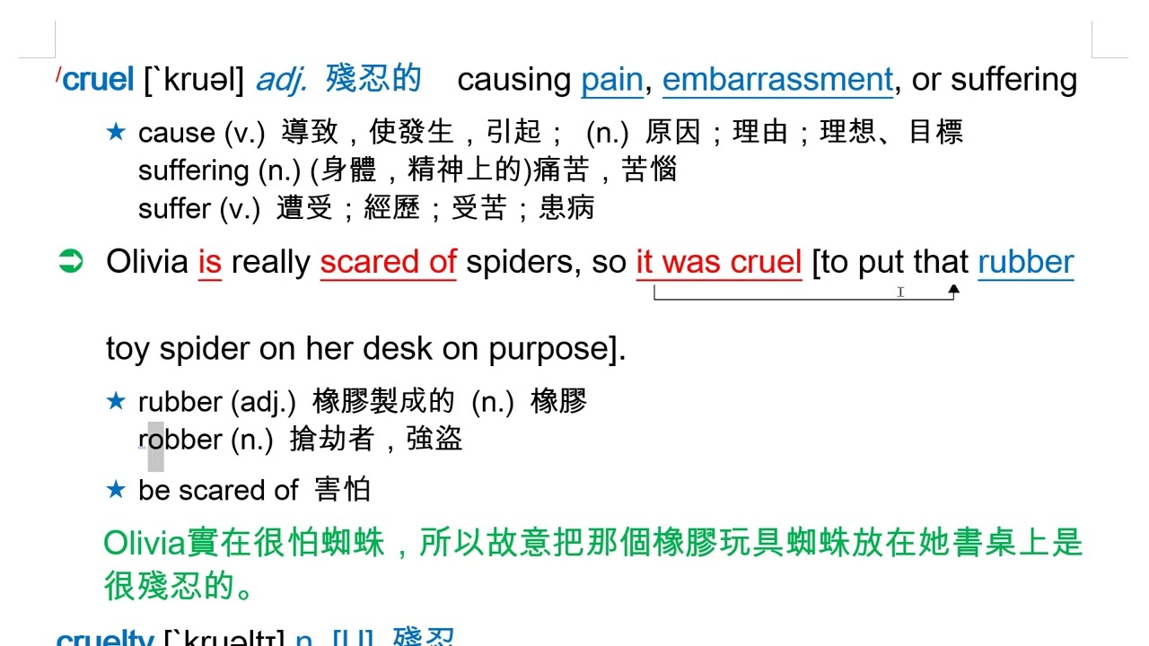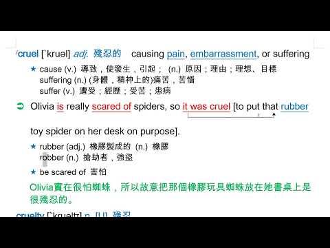 載入中... 相關課程 Back cruel [`kruəl] adj. 殘忍的 相關課程 0 / 750 登入觀看 ⇐ Use this menu to view and help create subtitles for this video in many different languages. You'll probably want to hide YouTube's captions if using these subtitles. cruel [`kruəl] adj. 殘忍的 上傳學習單 下載學習單
