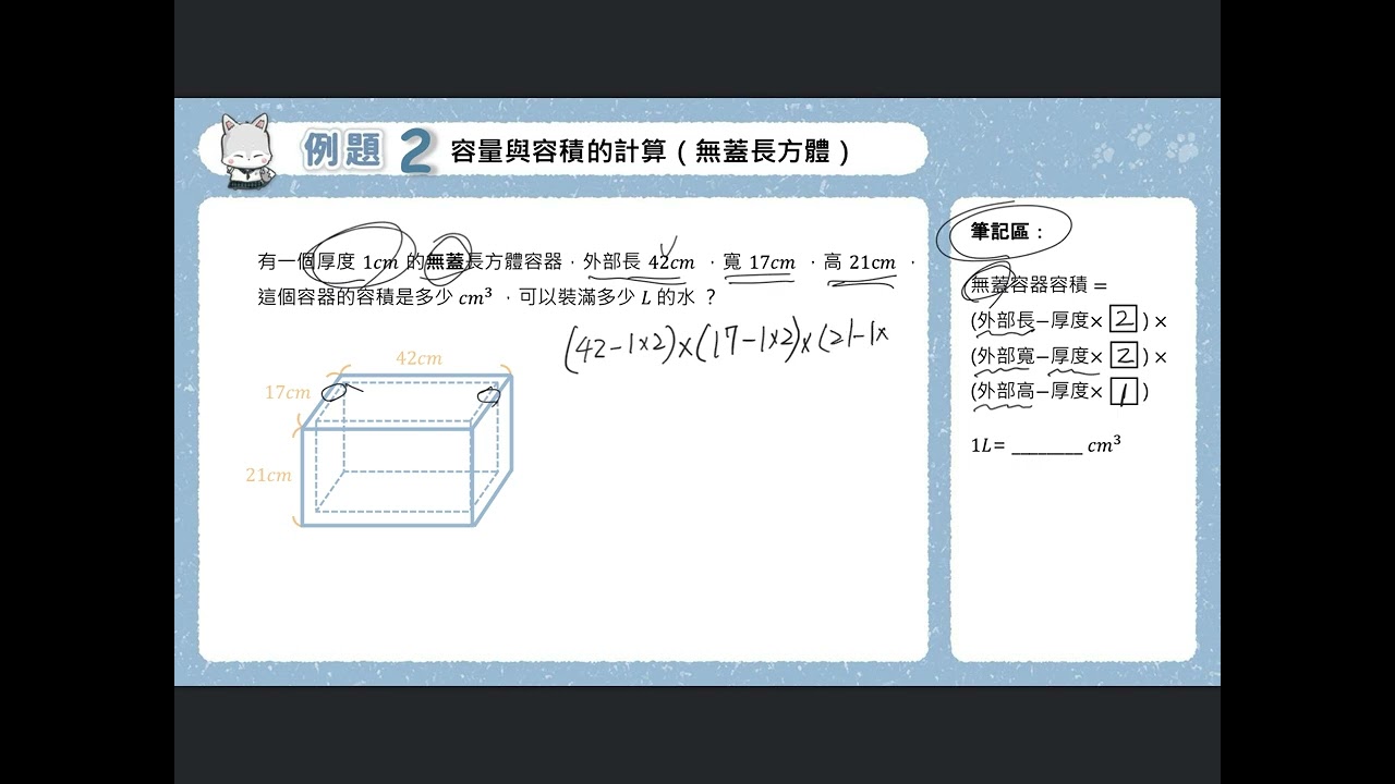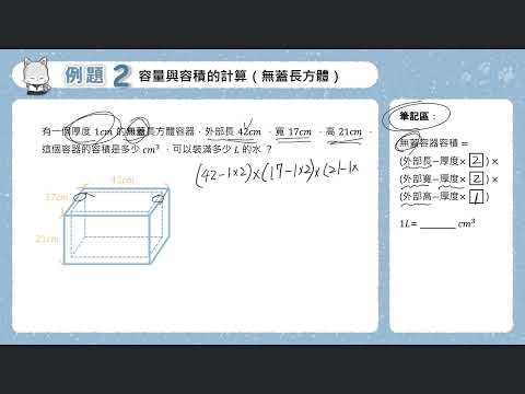載入中... 相關課程 Back 五下 單元3 9 例題2 容量與容積的計算(無蓋長方體) 相關課程 0 / 750 登入觀看 ⇐ Use this menu to view and help create subtitles for this video in many different languages. You'll probably want to hide YouTube's captions if using these subtitles. 五下 單元3 9 例題2 容量與容積的計算(無蓋長方體) 上傳學習單 下載學習單