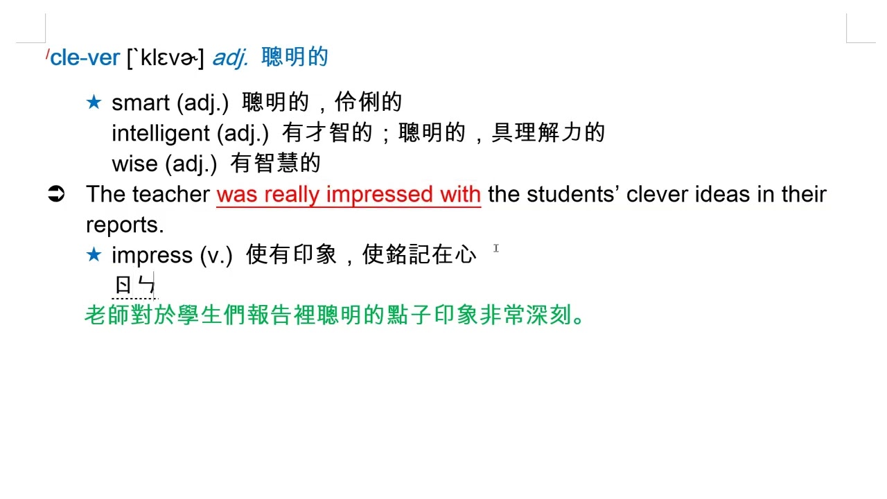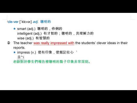 載入中... 相關課程 Back clever [`klɛvɚ] adj. 聰明的 相關課程 0 / 750 登入觀看 ⇐ Use this menu to view and help create subtitles for this video in many different languages. You'll probably want to hide YouTube's captions if using these subtitles. clever [`klɛvɚ] adj. 聰明的 上傳學習單 下載學習單