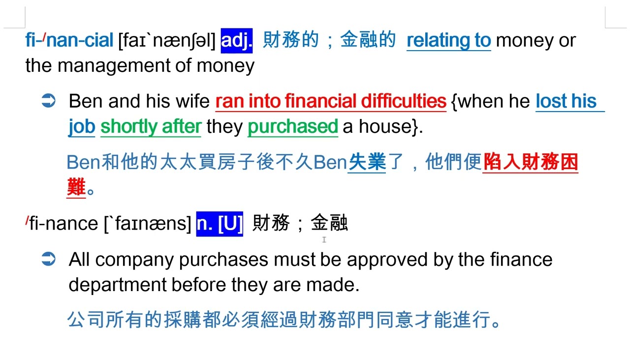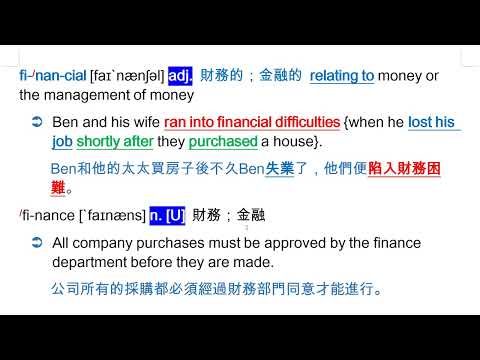 載入中... 相關課程 Back financial [faɪ`nænʃəl] adj. 財務的;金融的 相關課程 0 / 750 登入觀看 ⇐ Use this menu to view and help create subtitles for this video in many different languages. You'll probably want to hide YouTube's captions if using these subtitles. financial [faɪ`nænʃəl] adj. 財務的;金融的 上傳學習單 下載學習單